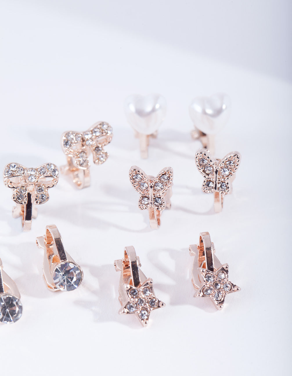 Kids Rose Gold Diamante Star Butterfly Heart & Bow Clip On Earring 5-Pack