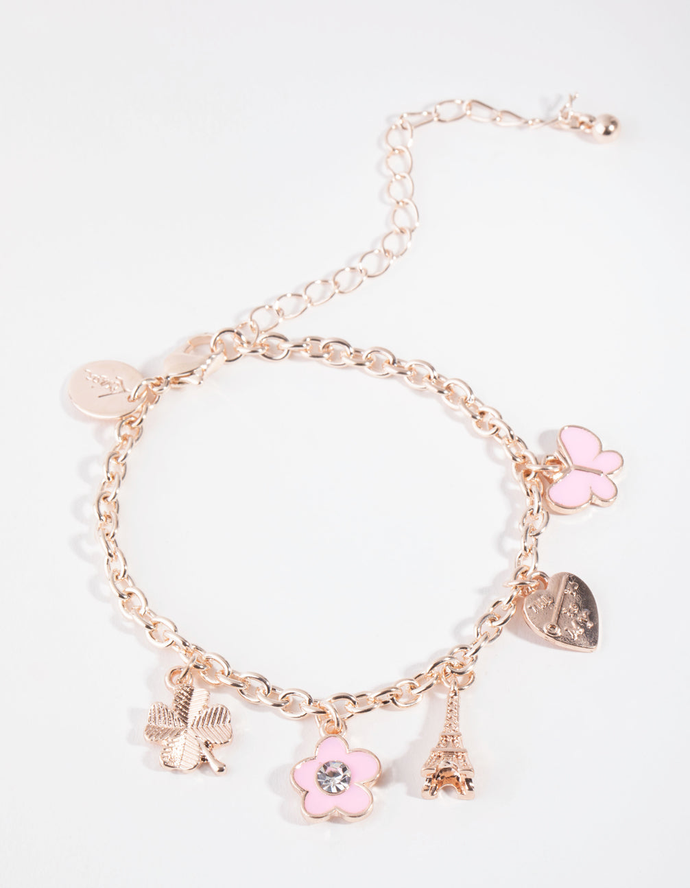 Lovisa KidsÕ Collection is perfect for little ones with big imaginations. Let them express their individuality with this lovely gold-toned bracelet, which features a mix of charms that includes the eiffel tower, a four leaf clover and flower and butterfly designs. Classy meets cute!