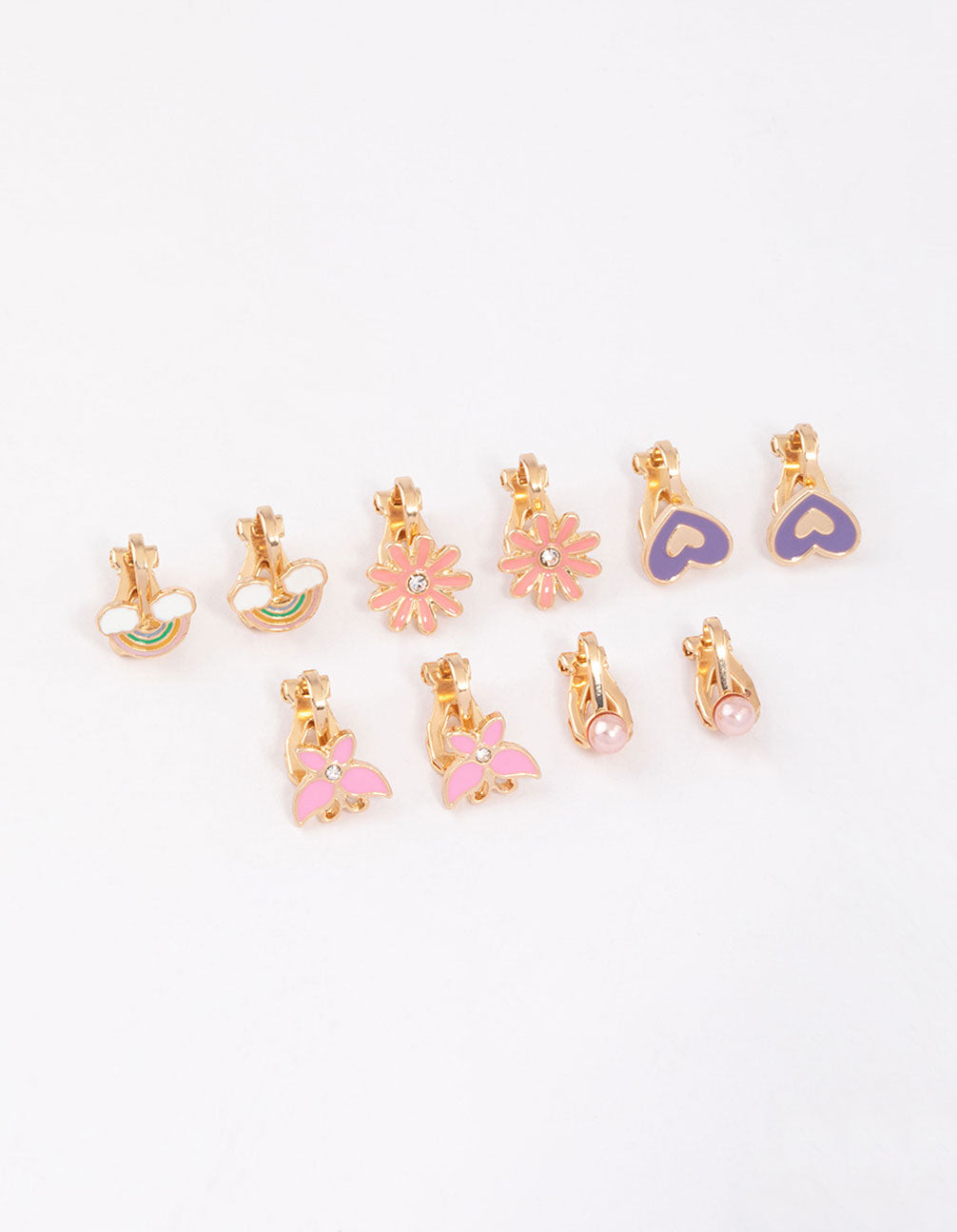 - This earring pack contains six pairs of clip on earrings, featuring floral motifs for a garden-inspired stack.