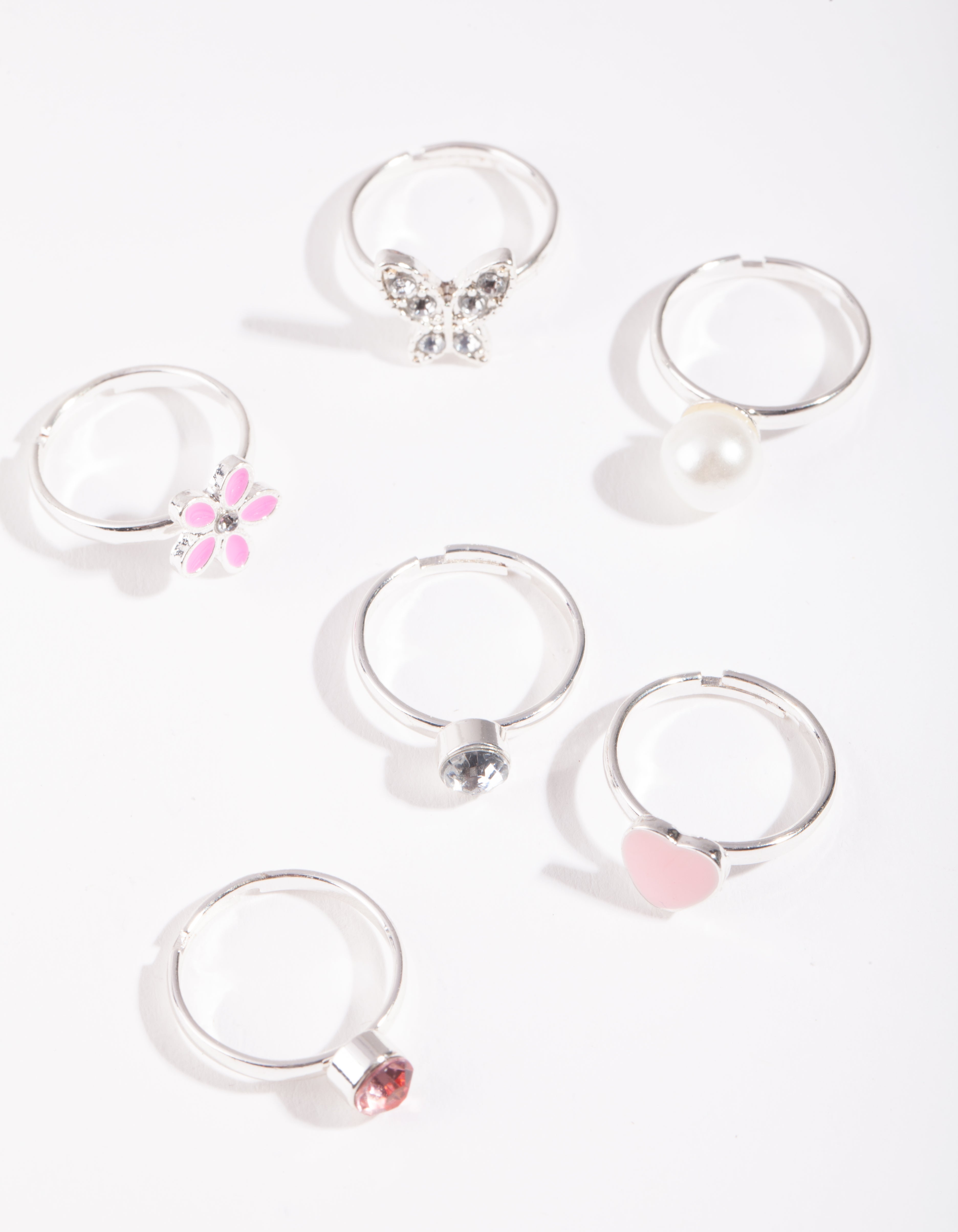 The Lovisa Kids collection is designed for little ones with big imaginations. This ring pack comes with a silver heart and flower design.
