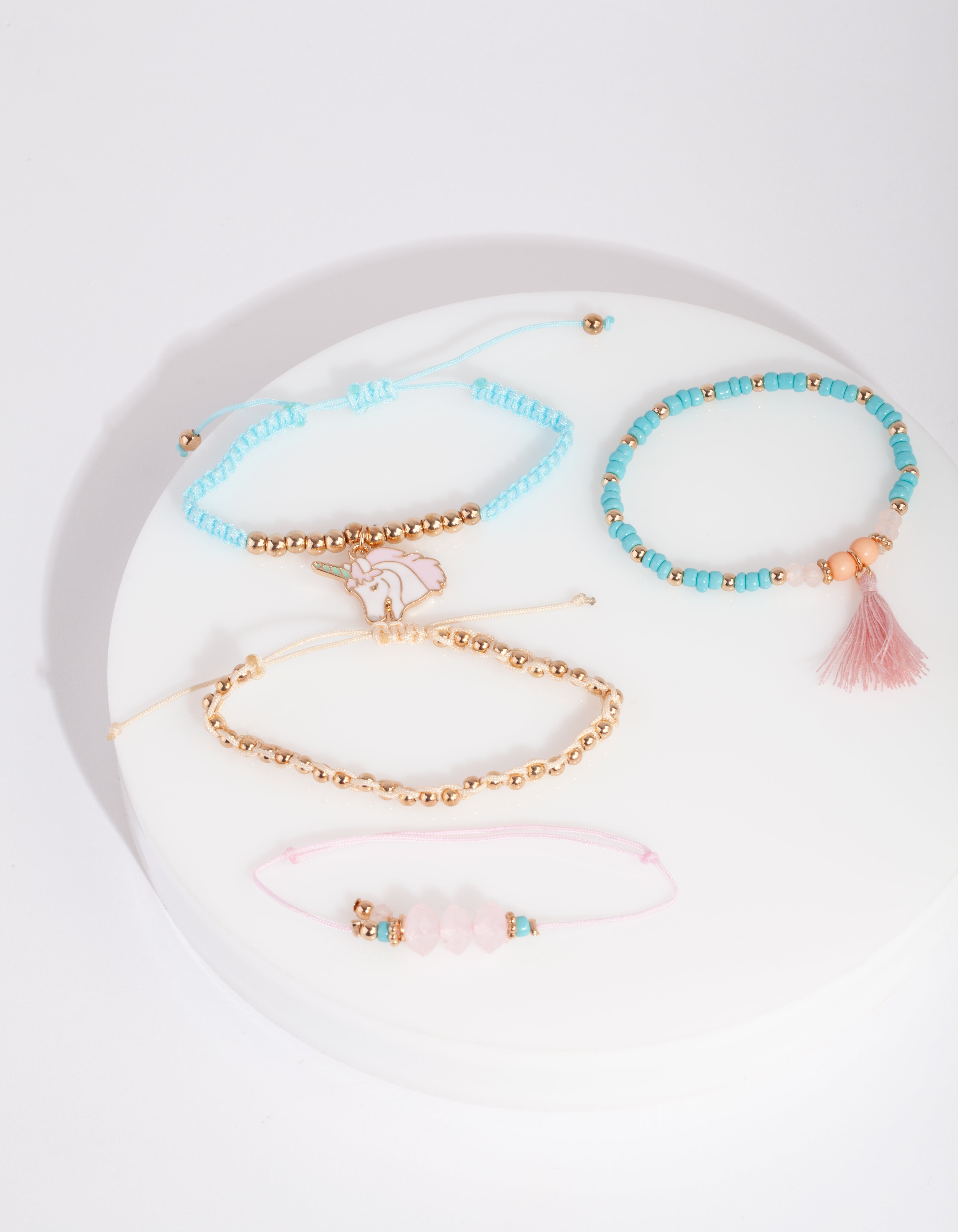 This bracelet pack boasts four gold-tone accented bracelets featuring a unicorn pendants in a variety of pastel stretch bead settings or adjustable threads. They are perfect for sharing with your best friends.