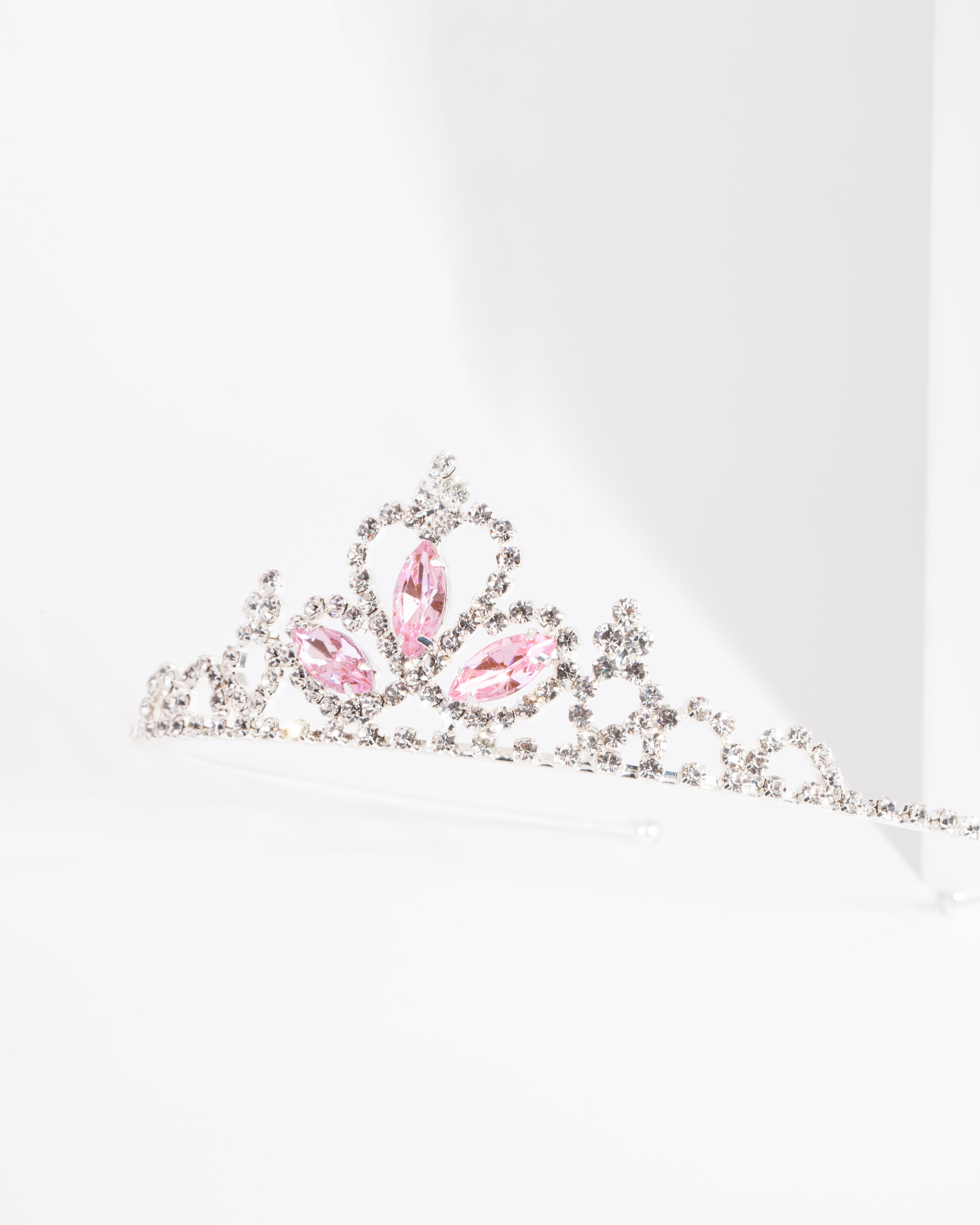 This silver-toned tiara features a royal design with diamante and pink stone embellishments.