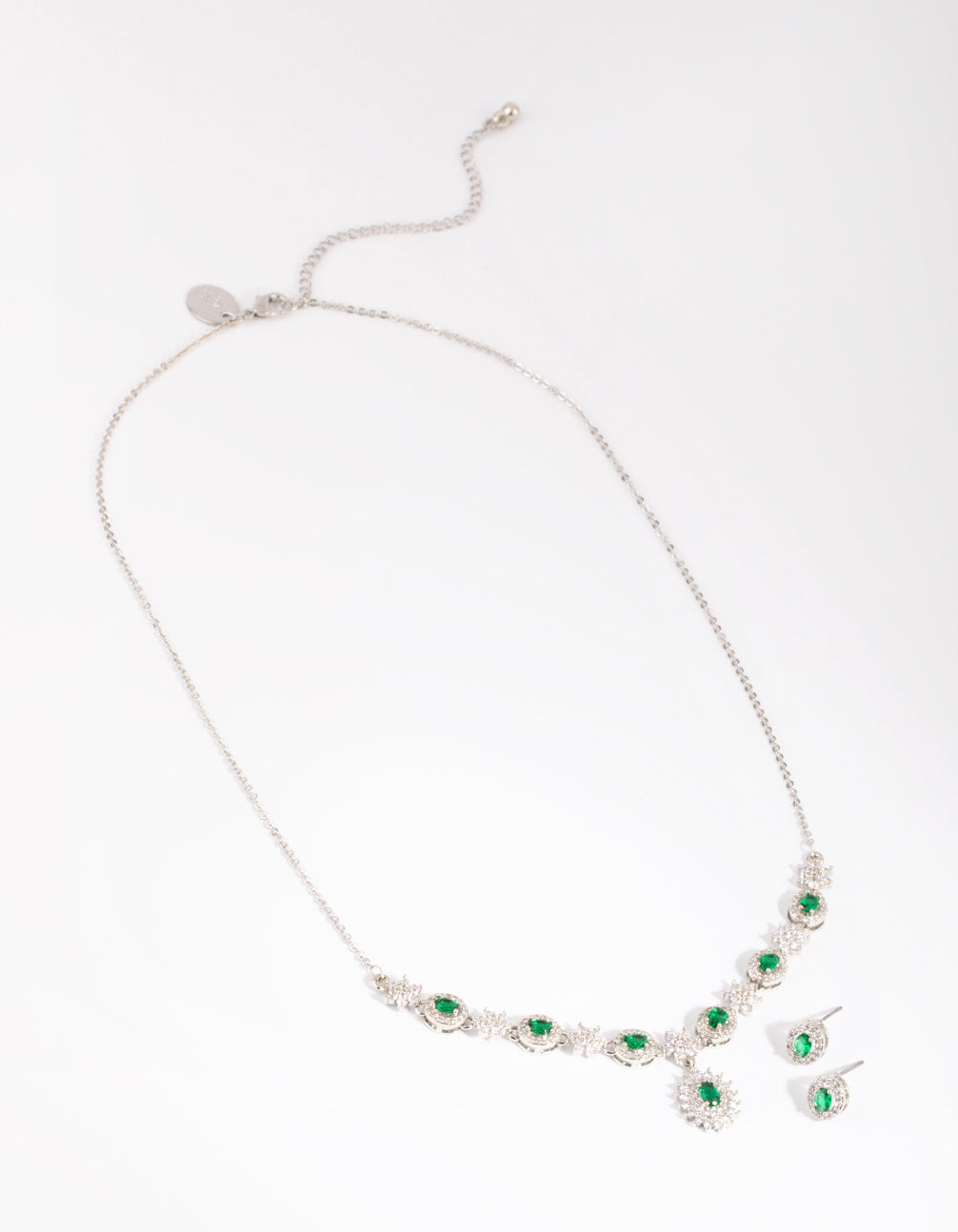 Silver Emerald Diamond Simulant Necklace & Earring Set