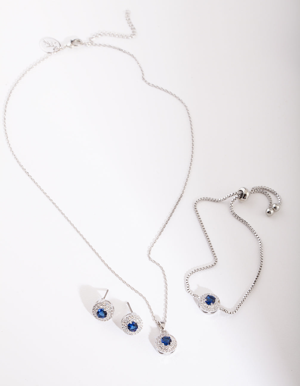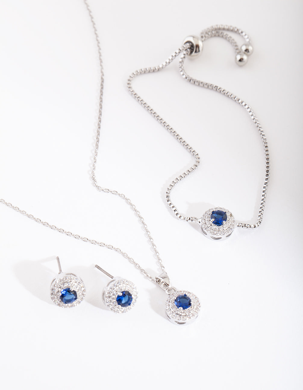 Diamond simulants are cut to be indistinguishable to the human eye from a real diamond, making them a luxurious addition to any collection. This set boasts sapphire-blue embellishments on a silver-toned setting.