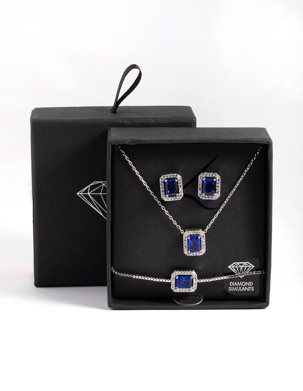 Silver Diamond Simulant Square Halo Earring, Necklace & Bracelet Set