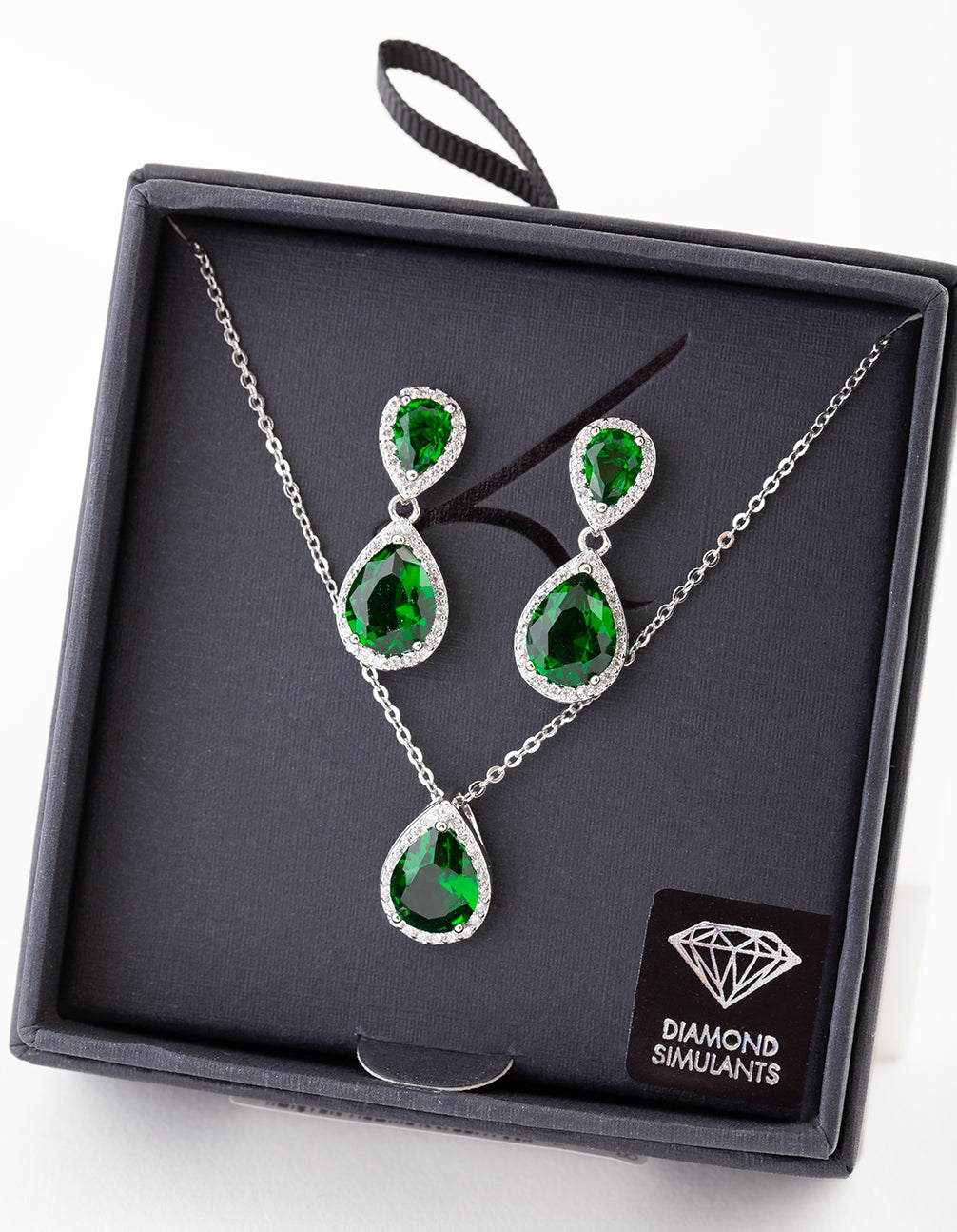 Diamond simulants are cut to be indistinguishable to the human eye from a real diamond, making them a luxurious addition to any collection. This set boasts a green teardrop design on a silver-toned setting.