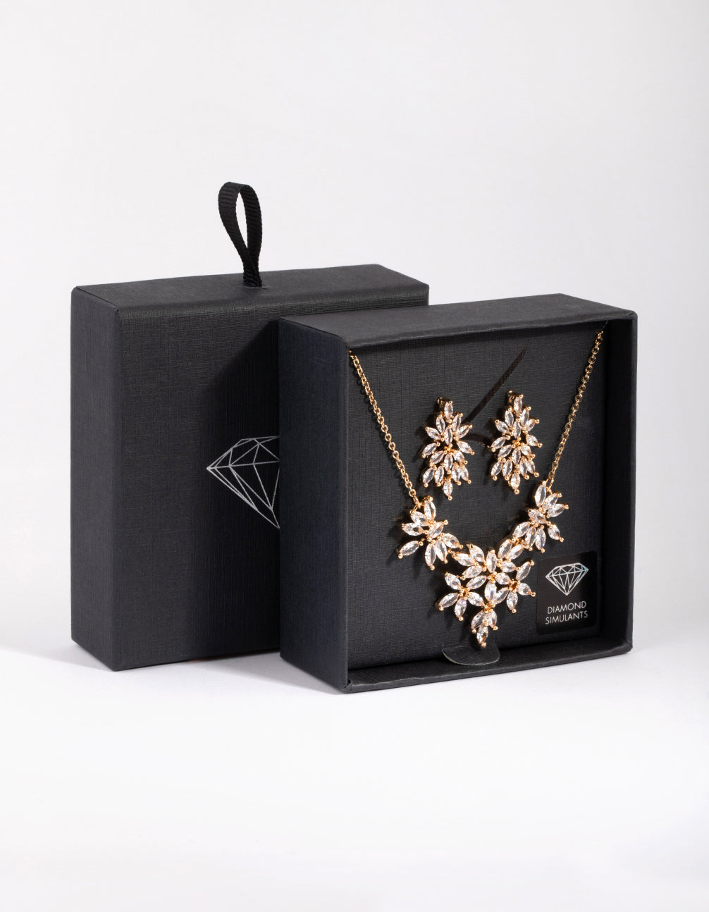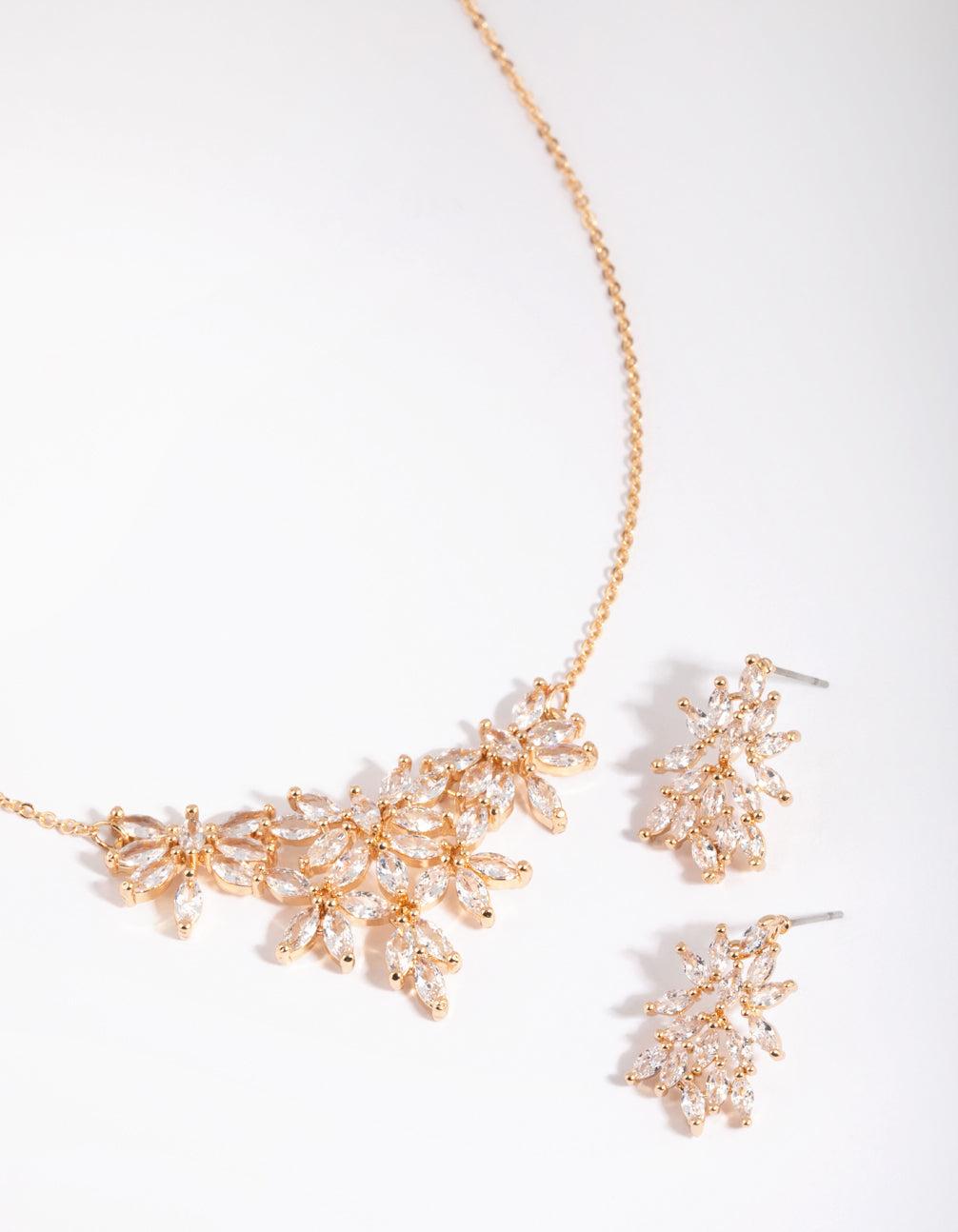 Gold Diamond Simulant Navette Flower Necklace & Earring Set