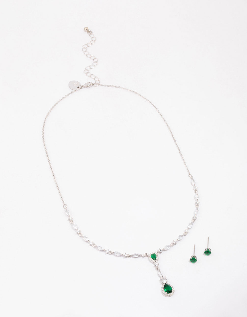 - This elegant jewellery set contains a silver emerald teardrop necklace and pair of matching emerald stud earrings.