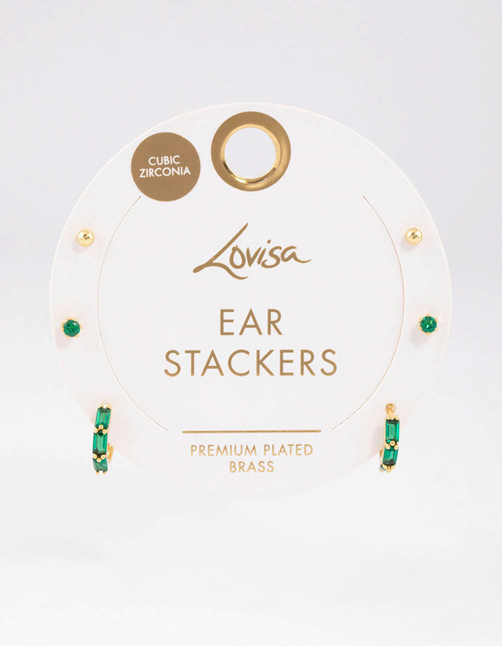 Gold Plated Brass Baguette Huggie Gold Ball Earrings 6-Pack