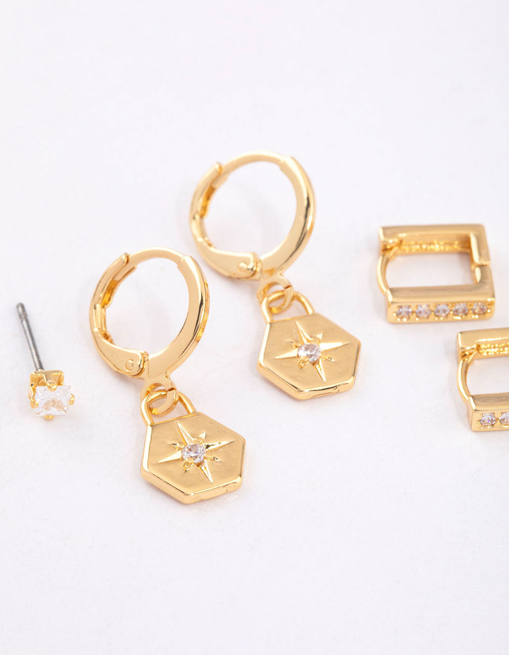 Gold Plated Brass Cubic Zirconia Hexagon & Square Earrings 6-Pack