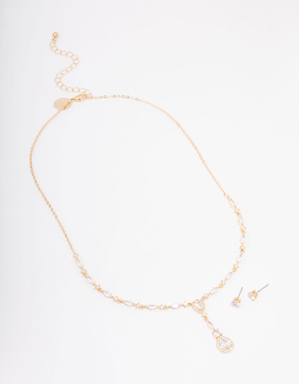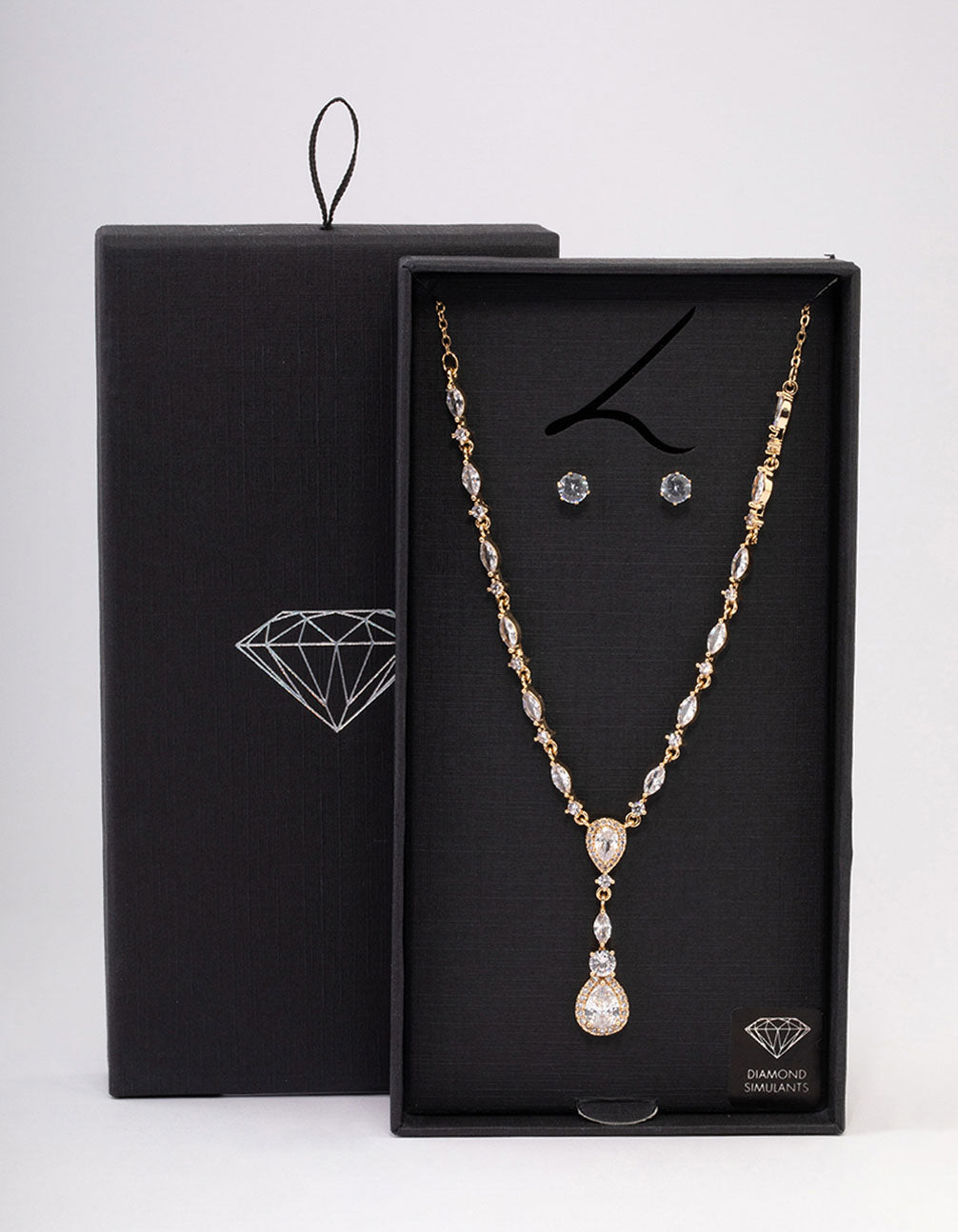- This gorgeous gold jewellery set contains a simple pair of oval, pear-shaped drop earrings and a sleek necklace to match.