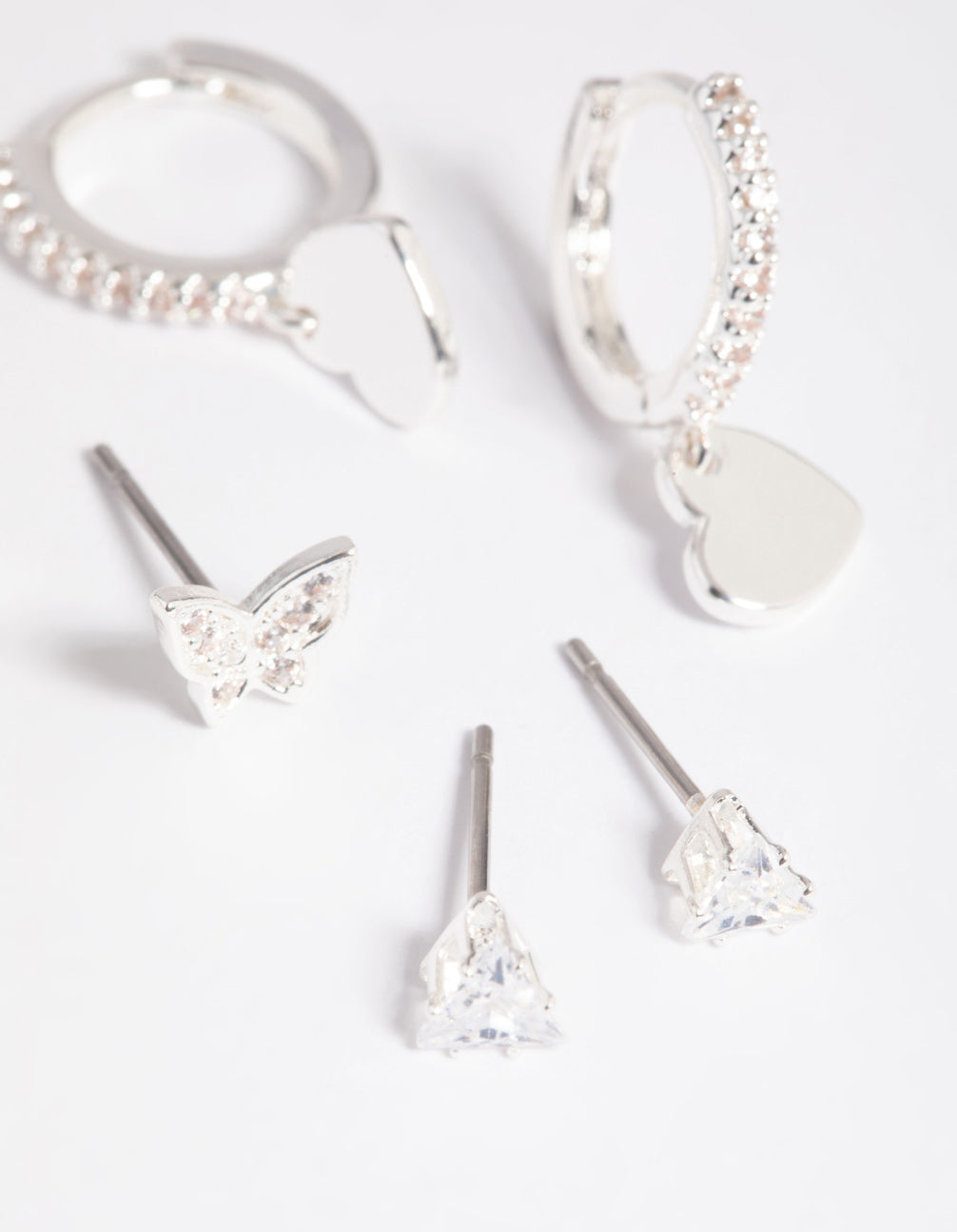 Mix them, match them, stack them! This earring pack features a variety of designs so it's perfect for layering. It's plated with real silver for authentic lustre and shine. It features adorable butterfly and heart motifs. Get creative!