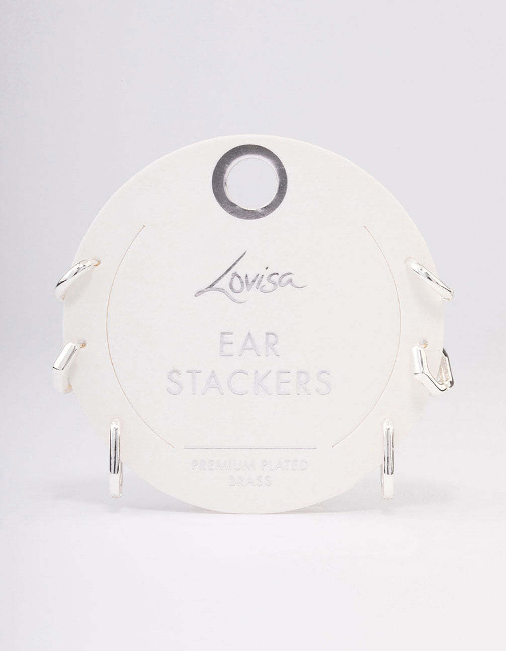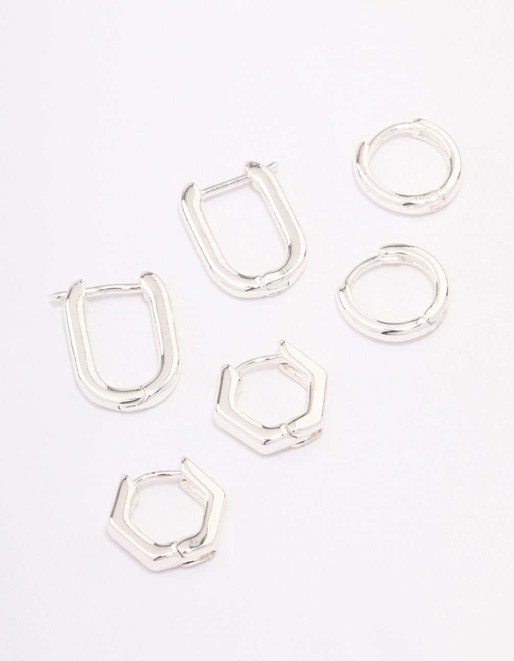 - This pack of hoop earrings contains three sets of silver plated brass, hexagon-shaped hoops. Perfect for adding a geometric edge to your ear stack.