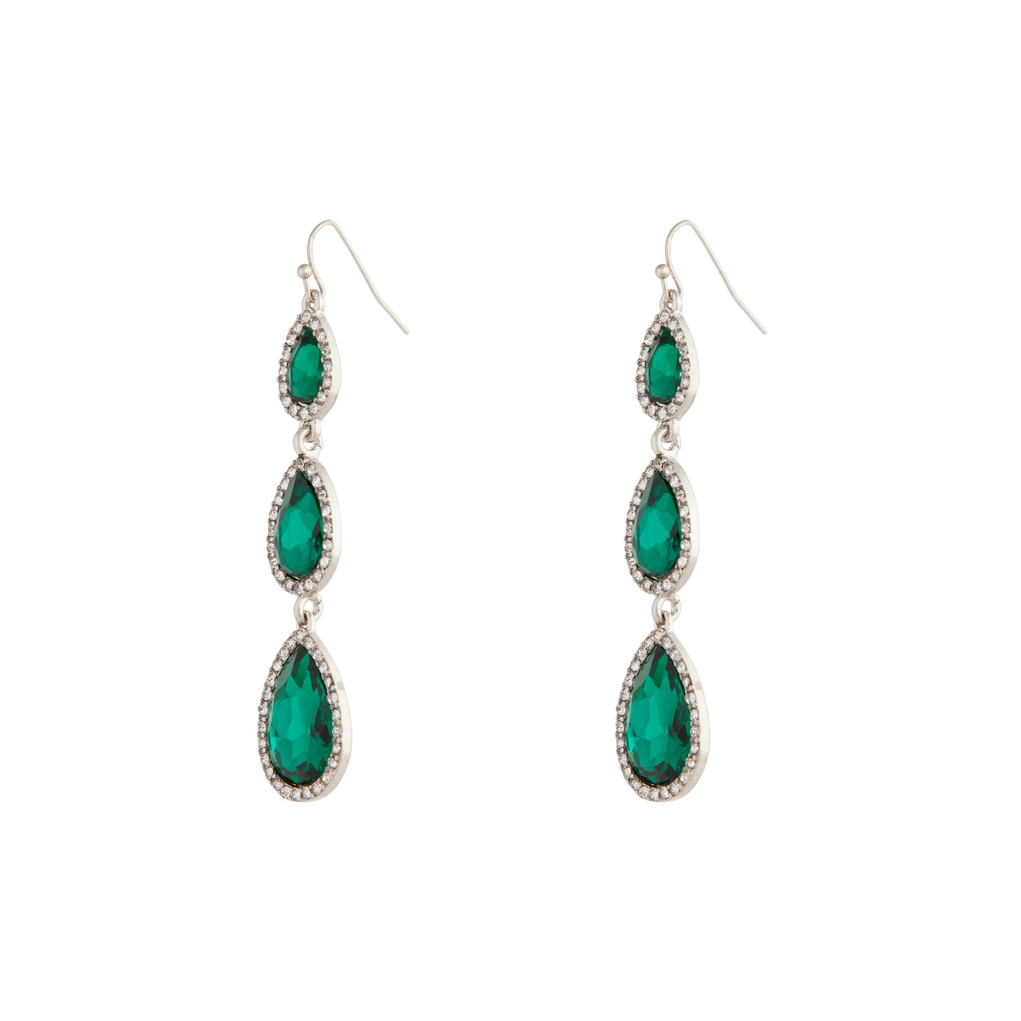 Add sheer elegance to your look with these silver-toned teardrop earrings. With three emerald-coloured embellishments surrounded by diamantes, these earrings are a sophisticated addition to your wardrobe.