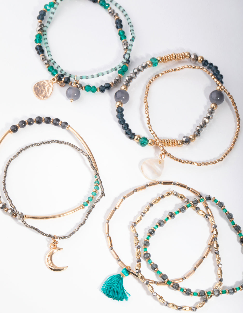 Style a beautiful celestial moment on your wrist! This set includes stretched bracelets that are adorned with beads, moon charms and tassels. Mix and match to your hearts content!