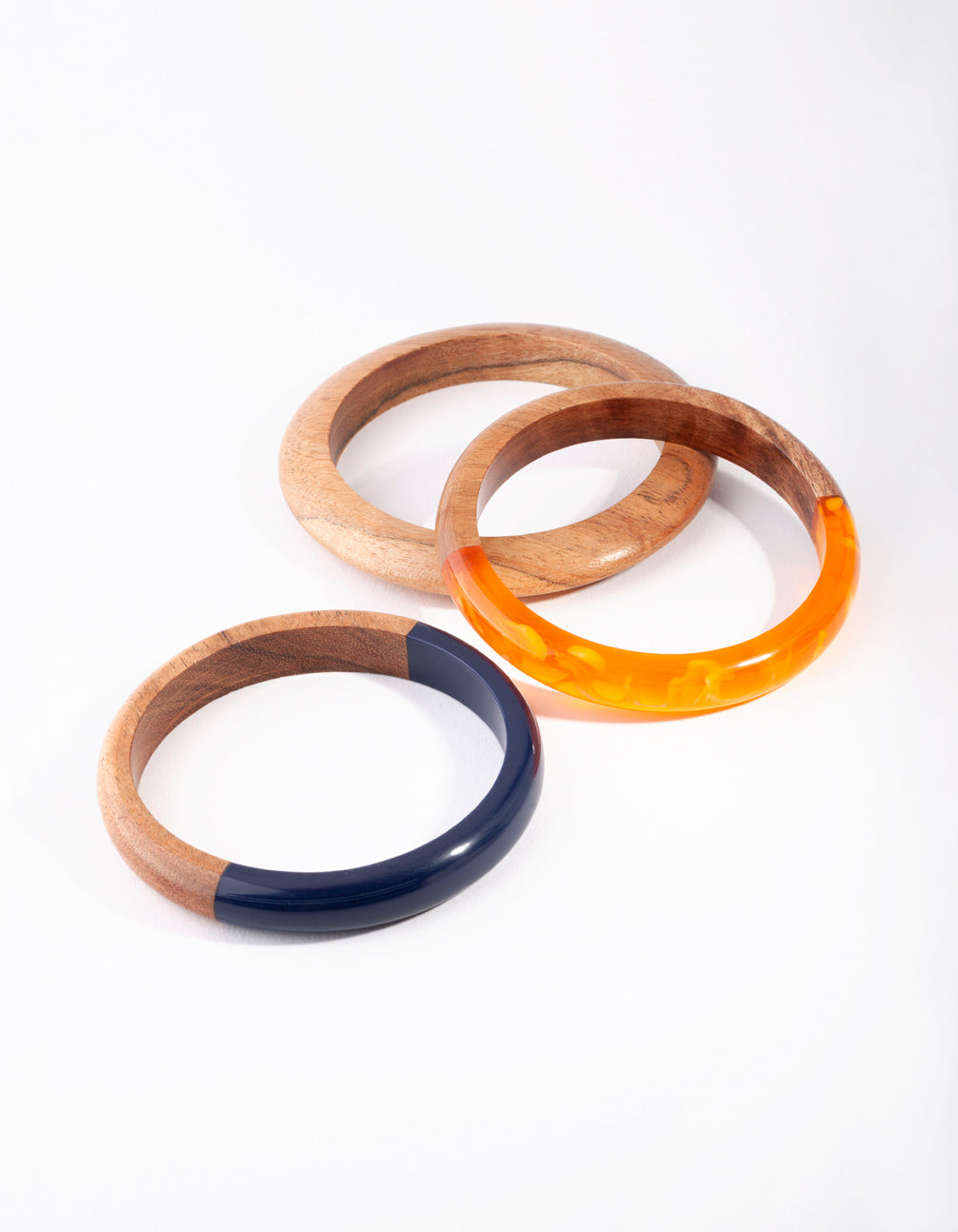 Bangles can add that finishing touch to your look. This pack comes with 3 wooden bangles with a spliced multi coloured design.