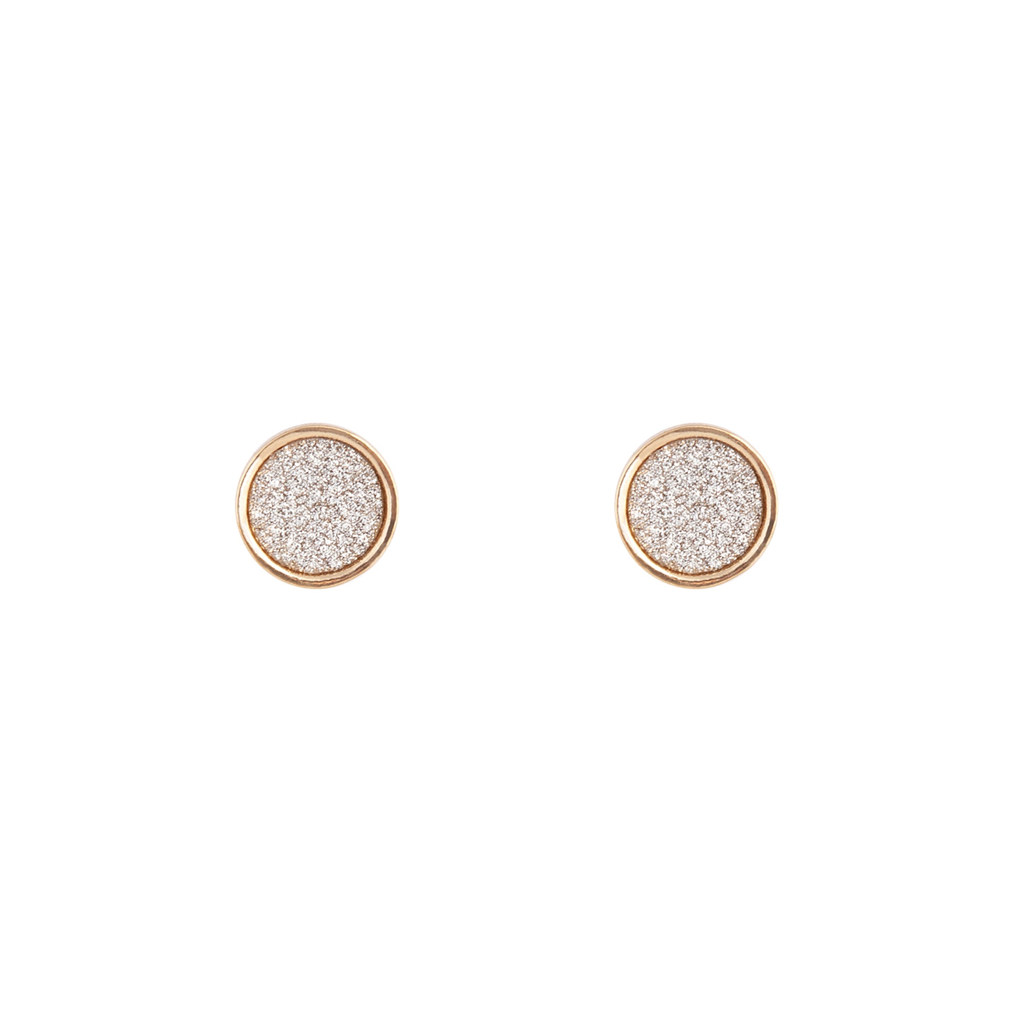 A pair of round silver glitter stud earrings with a gold-toned setting.