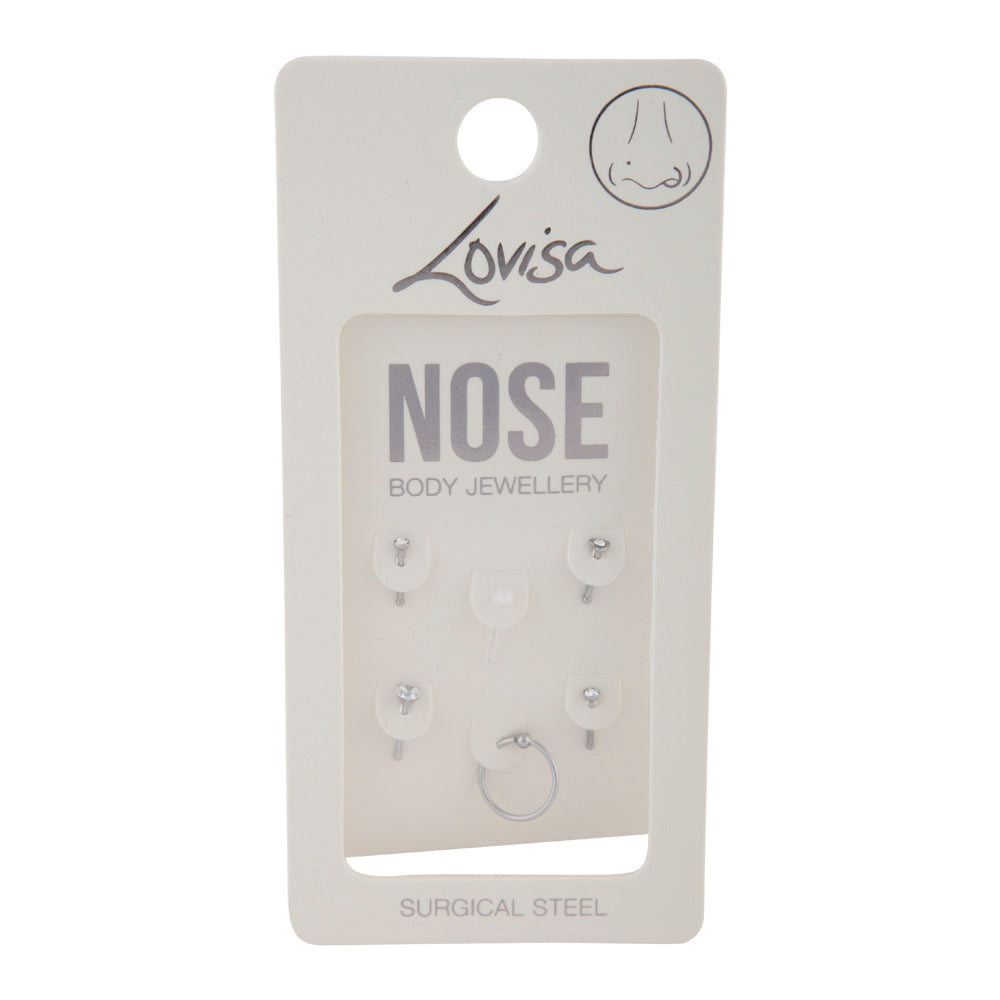 Lovisa body jewellery is made from surgical steel, making it the perfect option for everyday wear. This collection has been made with piercings in mind and features both trend-led and classic styles that you can swap out to suit any occasion. This pack comes with 6 different nose studs and hoops with a diamante and heart embellishments as well as a clear design. Mix and match your nose rings to coordinate with Lovisa accessories for a fashion-forward look!
