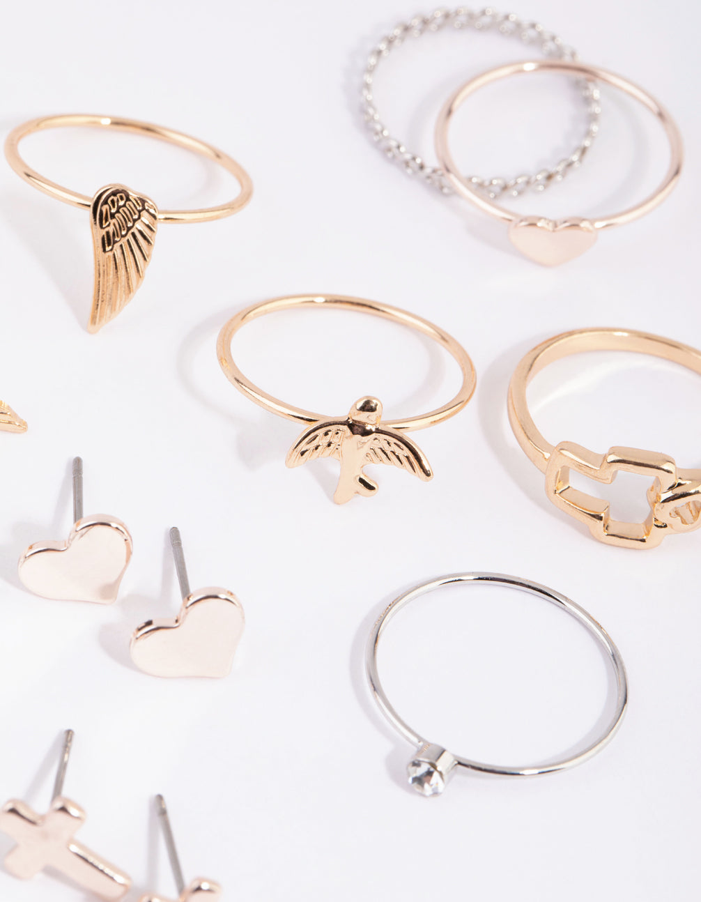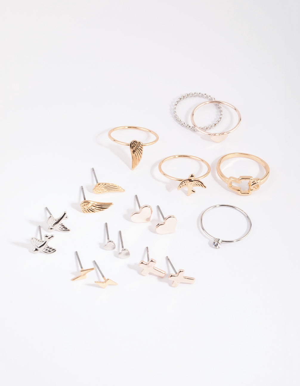 Mix them, match them, stack them! This earring and ring pack features a variety of designs so it's perfect for layering. Get creative!