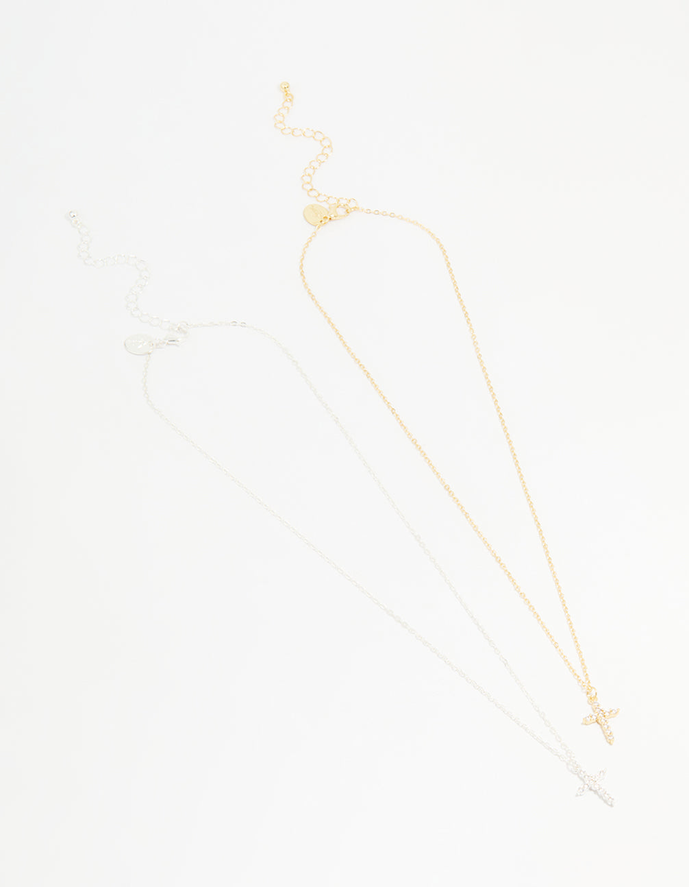 Mixed Metal Cross Cubic Zirconia Pendant Necklaces 2-Pack