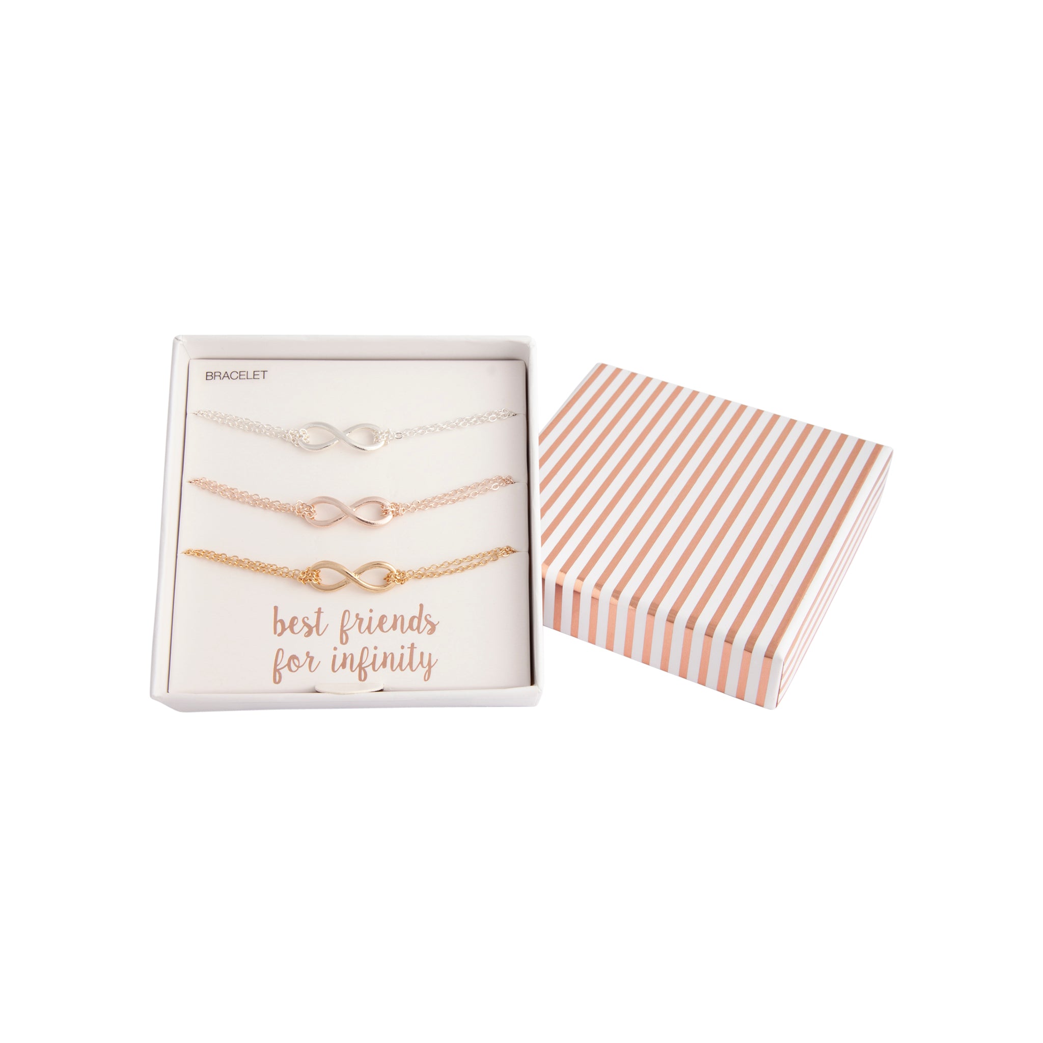 This bracelet set is perfect for gift giving. The set comes with a trio of bracelets in silver, gold and rose-gold tones. Each bracelet comes with an infinity pendant. The phrase "best friends for infinity" is written on the box.