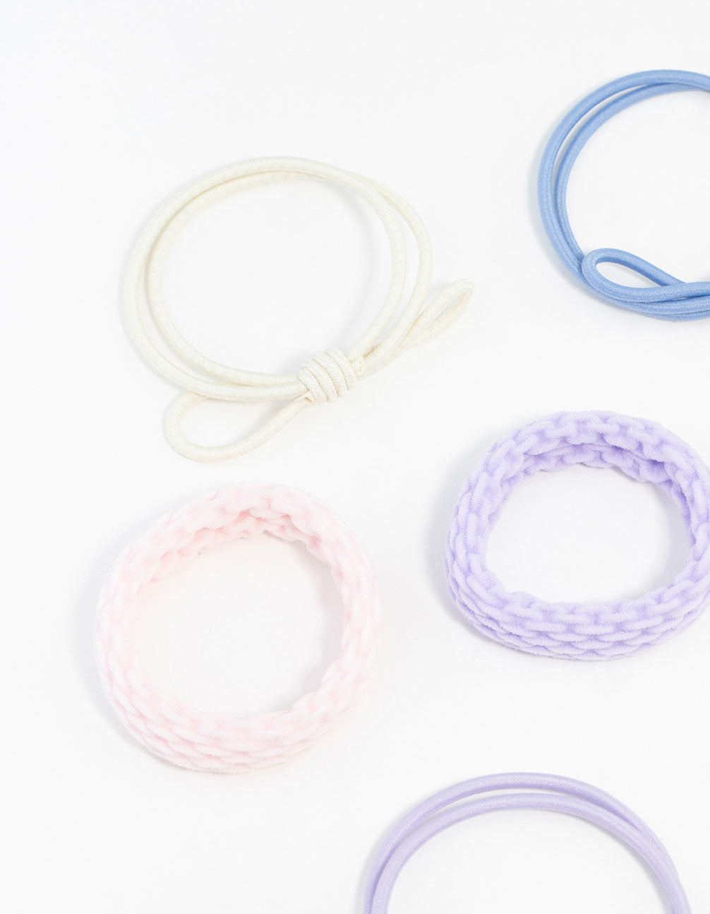 Stay stylish on the move with this chic hair tie set. Featuring pastel colors and funky flair, it offers seven stunning options including different textures, bows, and sleek designs. Perfect for adding a pop of pretty pastels to your hairstyles.