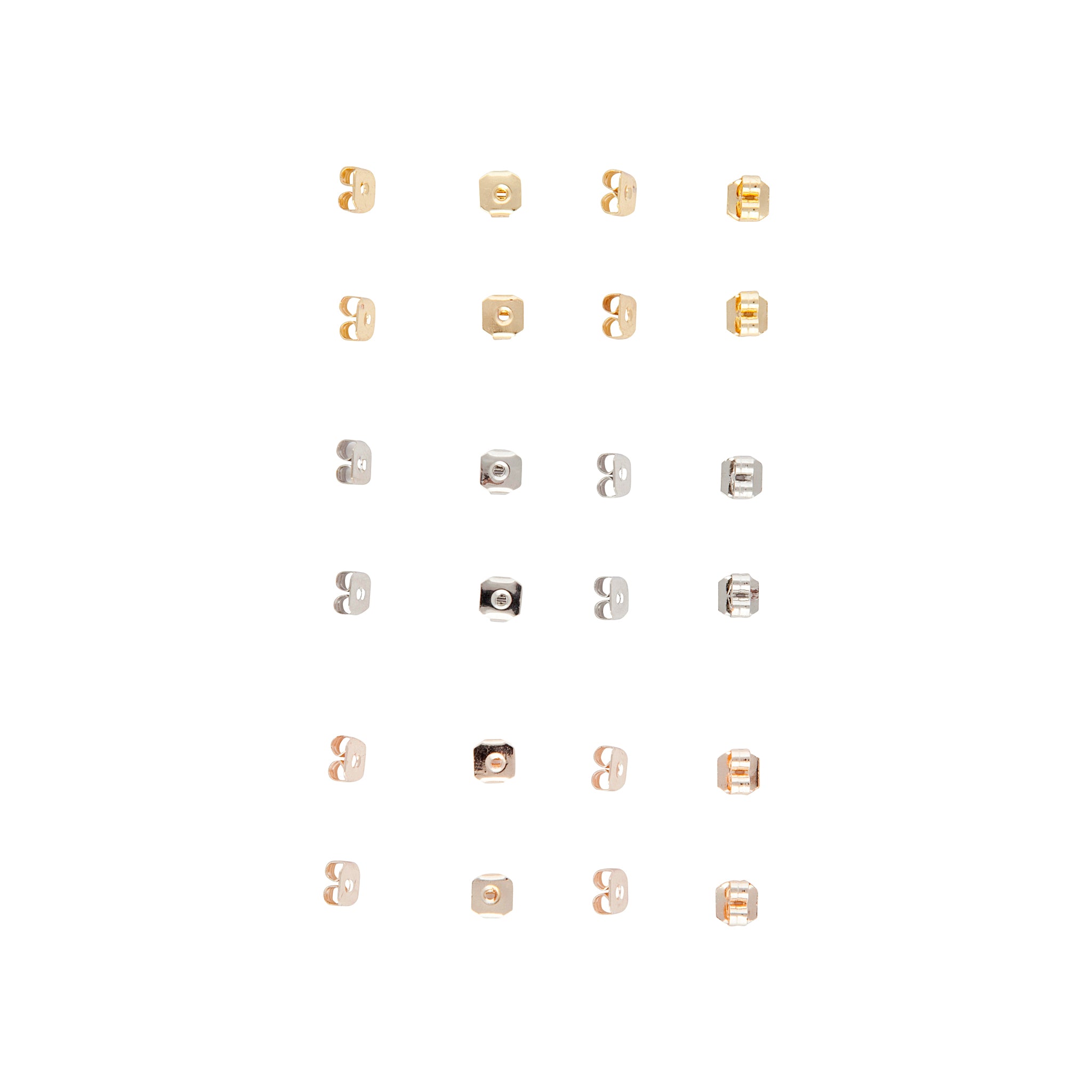 Handy essentials pack of stud backings in rose gold, silver and gold tone.