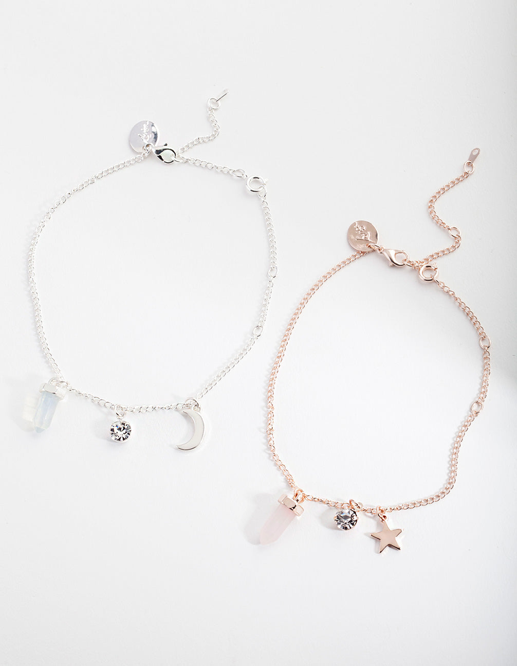 This pretty silver and rose-gold-toned set features semi-precious stones, designed to balance and restore. The set includes a pair of bracelets: each has a semi-precious shard, a diamante and a star or moon charm. Moonstone and rose quartz are included in this set. Gift to someone special, or treat yourself!