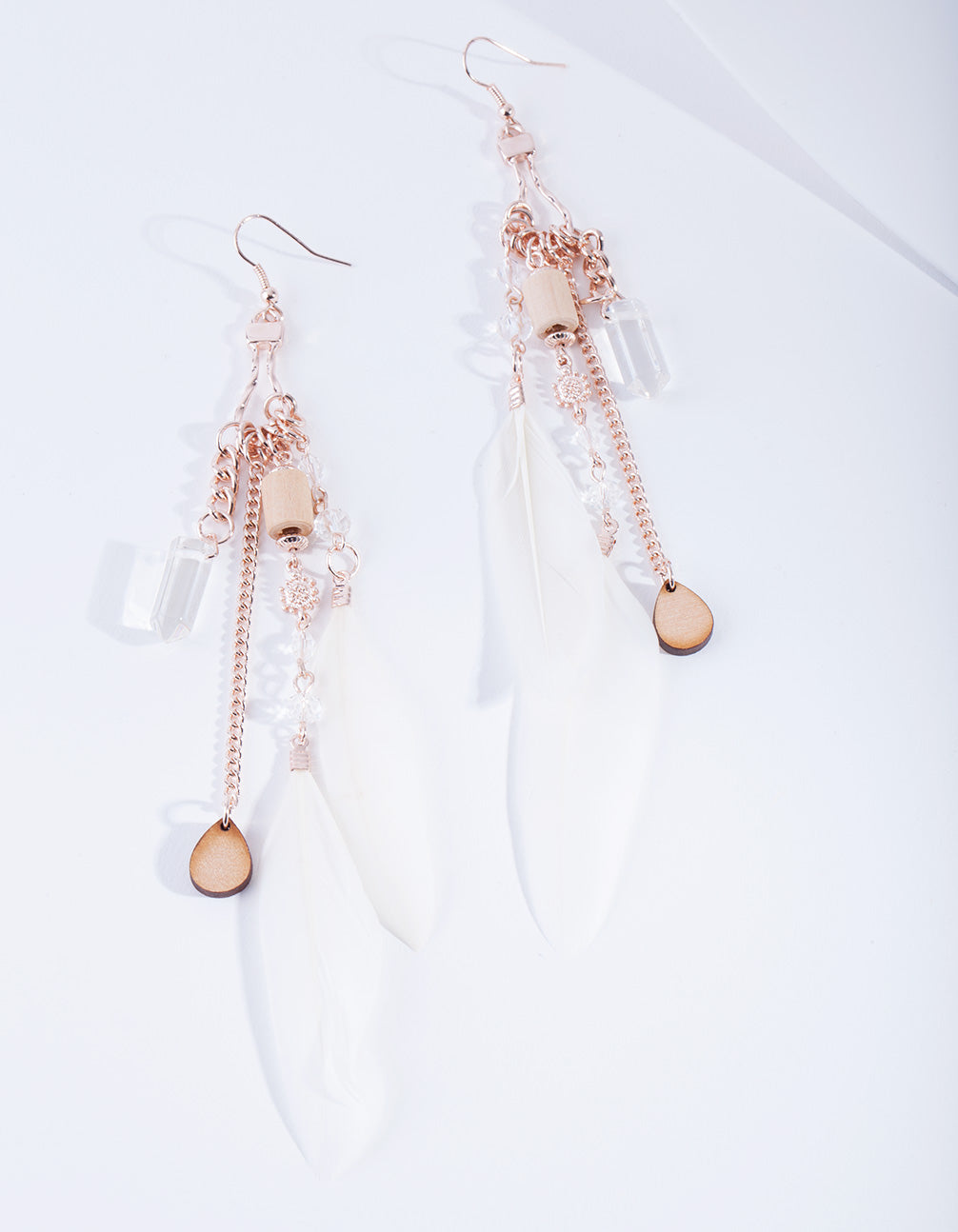 A pair of rose-gold-toned earrings with a feather and diamante design.