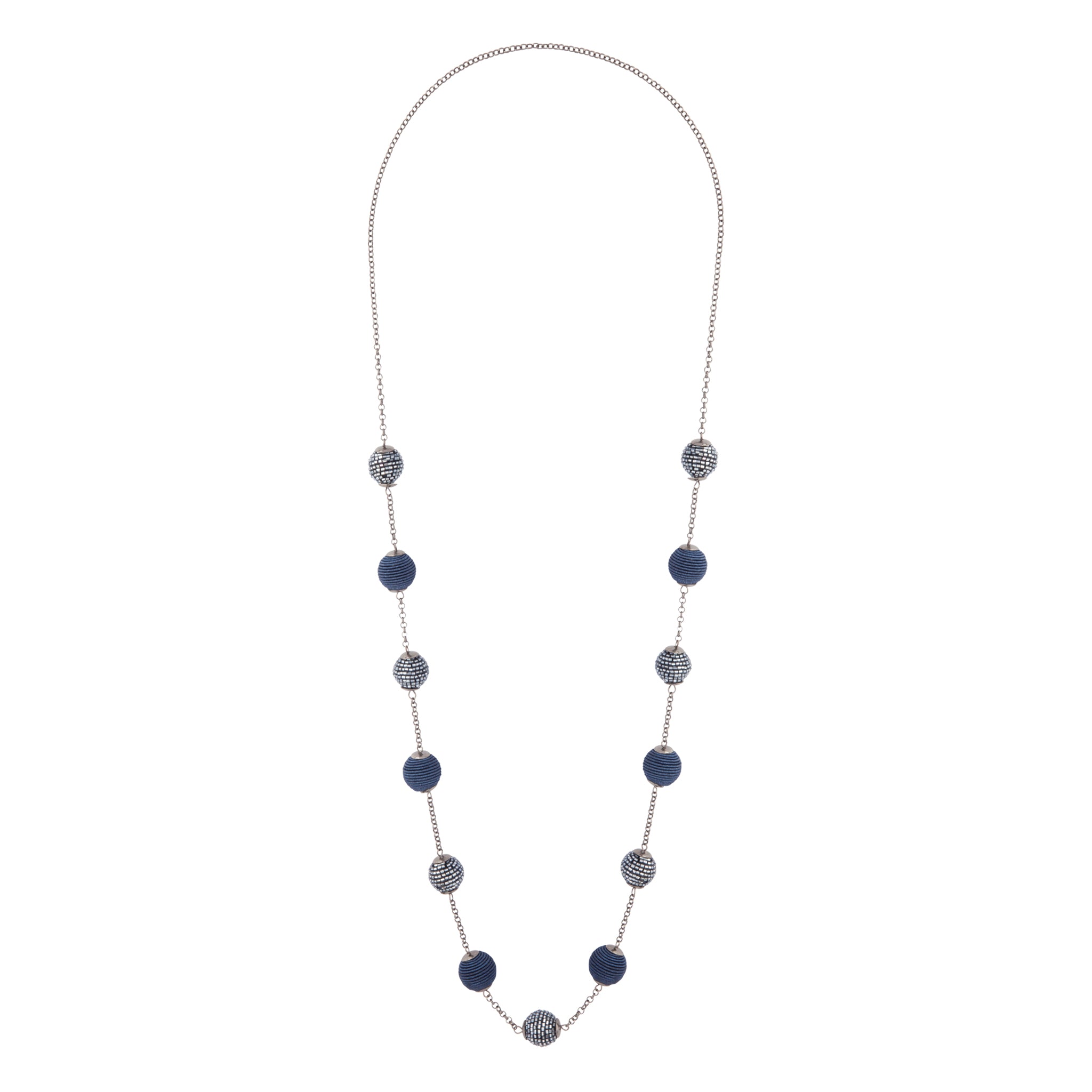 This long infinity style necklace has a gunmetal toned setting with beaded and fabric wrapped pendants in navy blue.