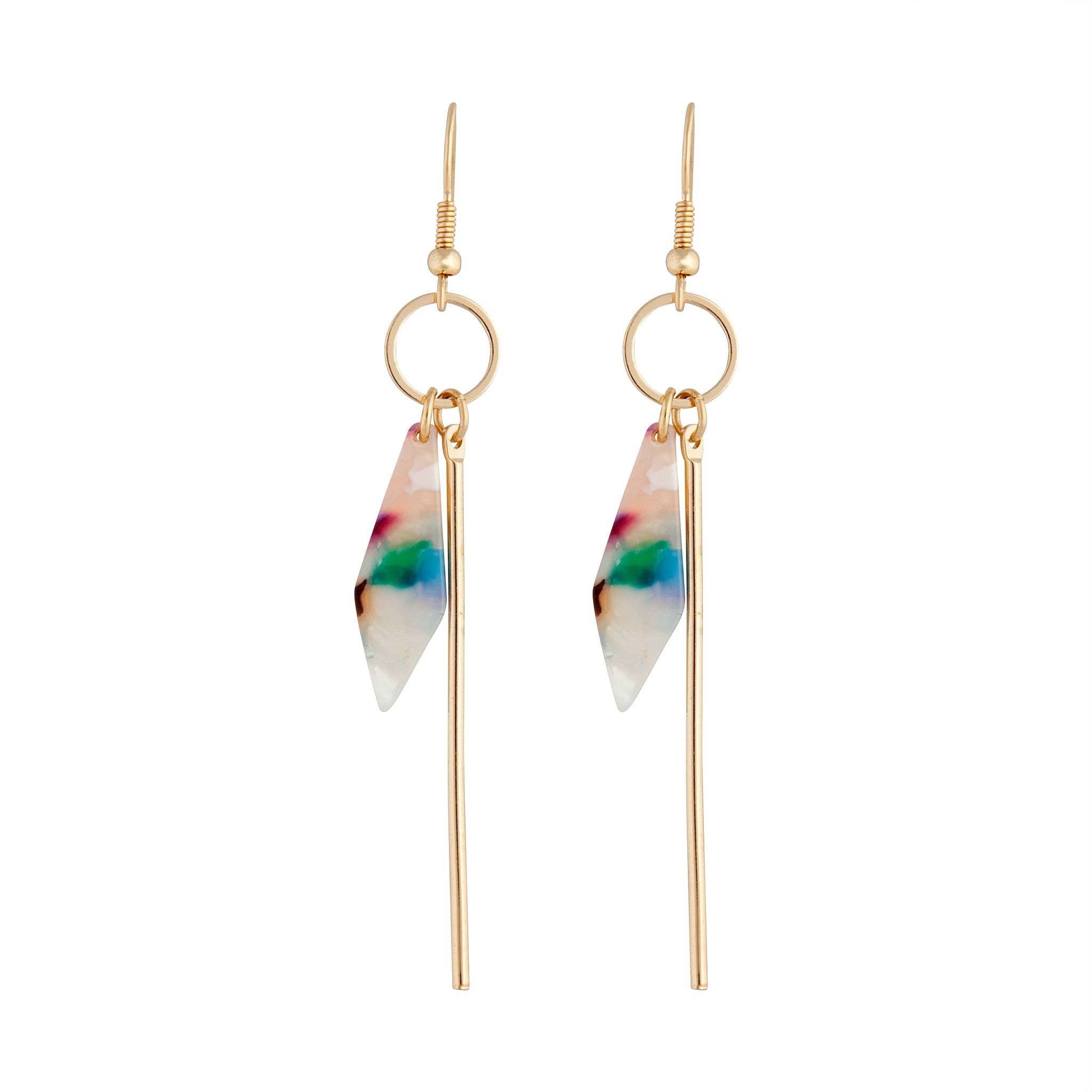 A pair of simple stick drop earrings with a multi-coloured acrylic charm.