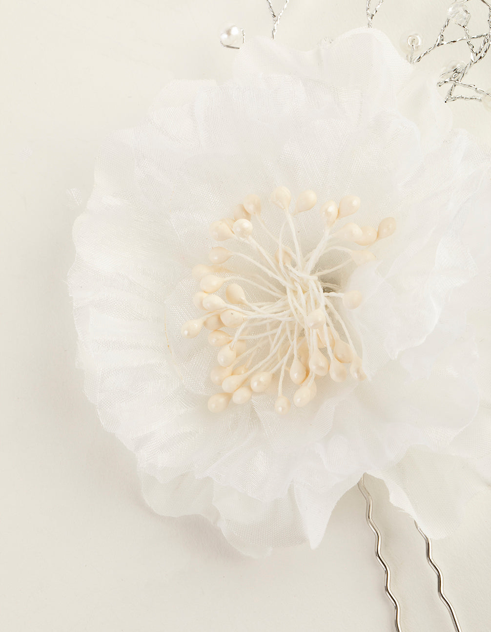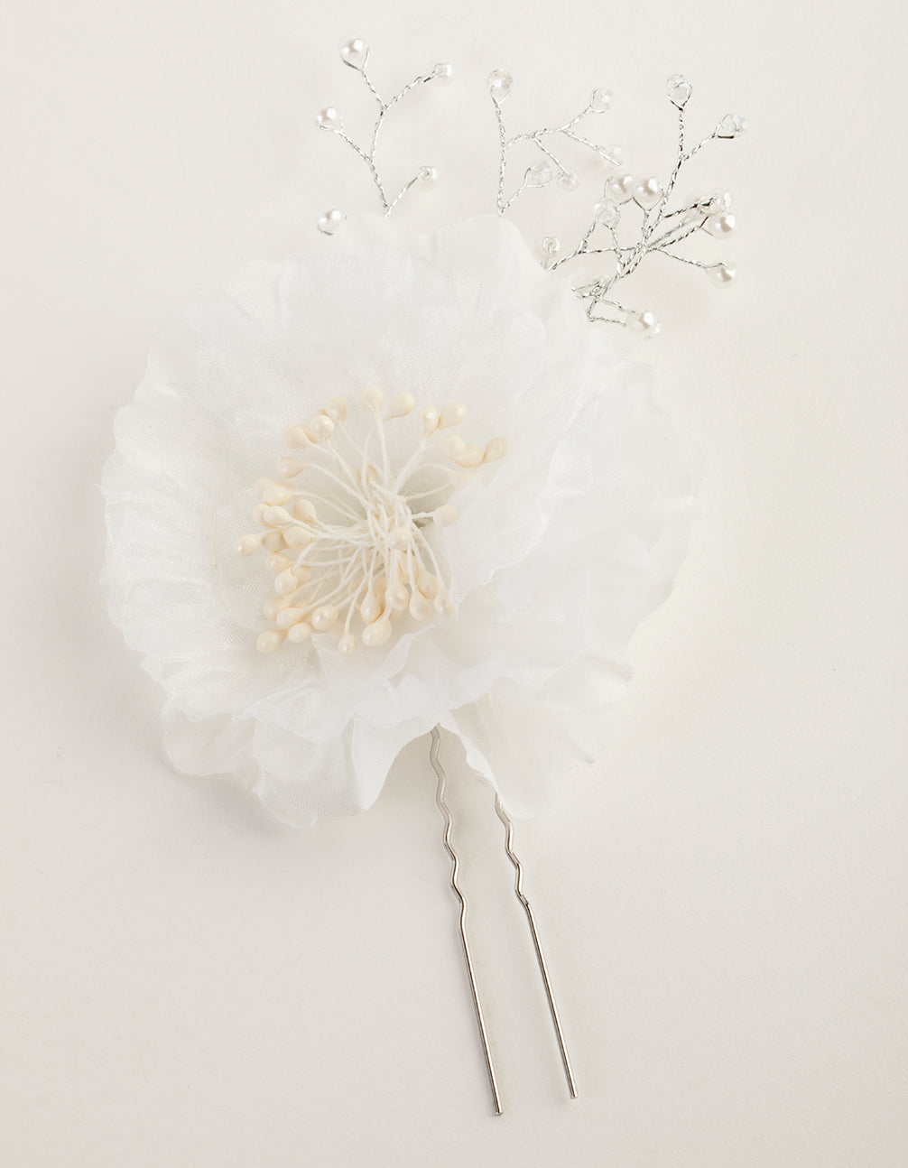 For a soft, pretty statement look with floral motifs look to our occasion pins! This one features a white fabric flower on a silver-toned vine with faux pearl and beaded embellishments. Simply stunning!