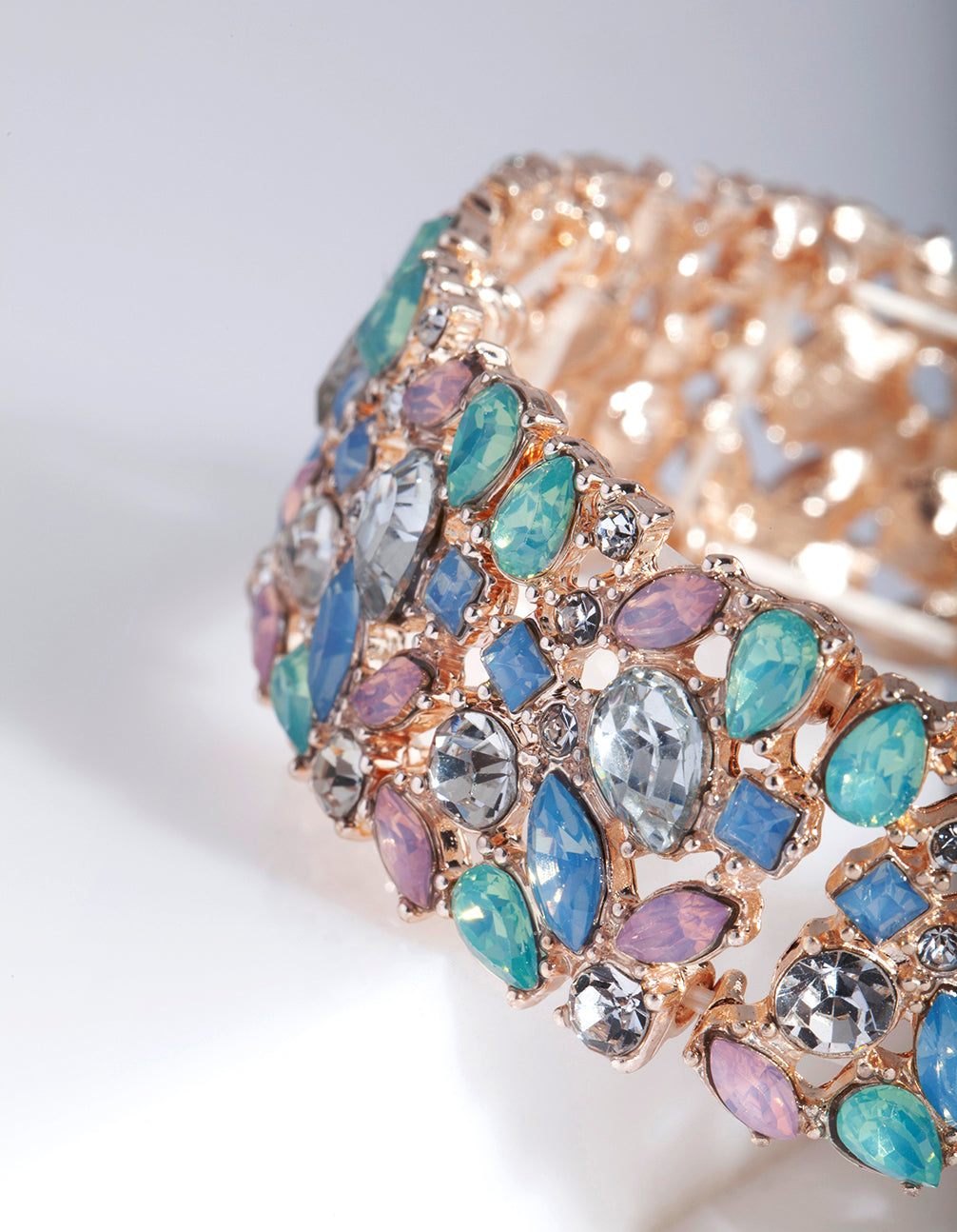 Bangles can be worn so many ways. On the wrist as a classic bracelet/bangle or higher on the arm for a trend-led look. This stretch bangle boasts a cluster pink, green and blue stone set design in a rose gold-tone setting.