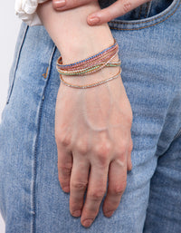 Layer up with bracelets to make an impact and elevate your look. This pack features multiple rainbow diamante styles on a gold-toned setting.