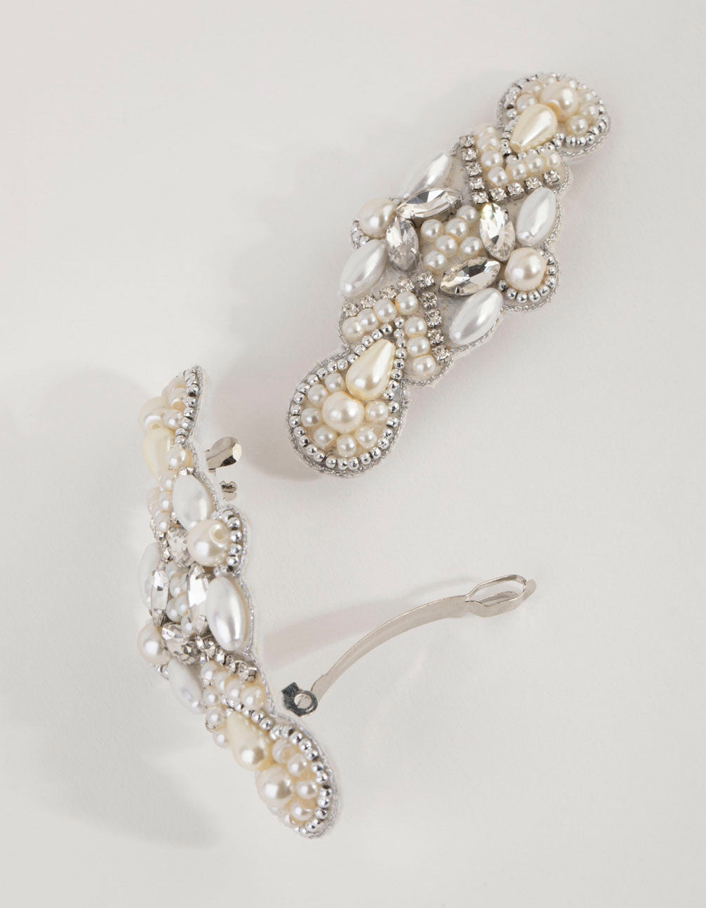 This stunning clip has been embellished by hand. It features ornate 1920s-inspired beadwork with faux pearl, diamante and crystal-like details. Simply stunning! Wear this for an elegant finishing touch to a formal ensemble.