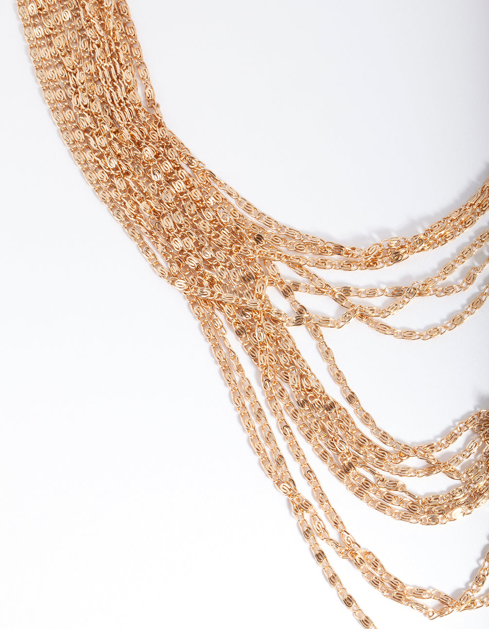Elevate your look with a stunning statement necklace. This necklace boasts a multi row chain design in a gold-tone setting.