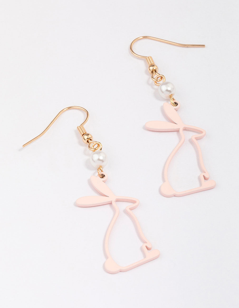 These earrings feature an outline of a pink bunny rabbit, perfect for styling this Easter!