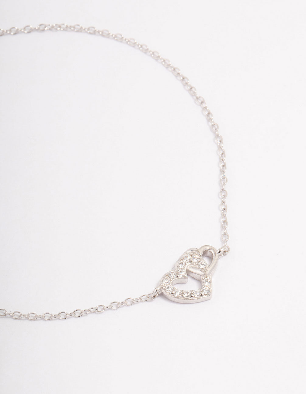 This dainty chain bracelet features a cubic zirconia encrusted, interlocking heart charm. Perfect for styling in your everyday stack.