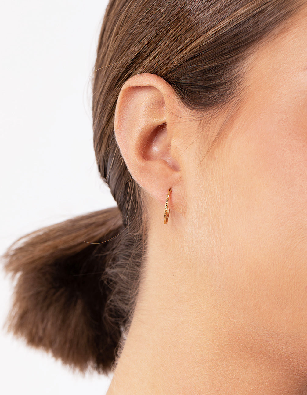 A pair of gold-plated sterling silver hoop earrings with a diamond cut finish.