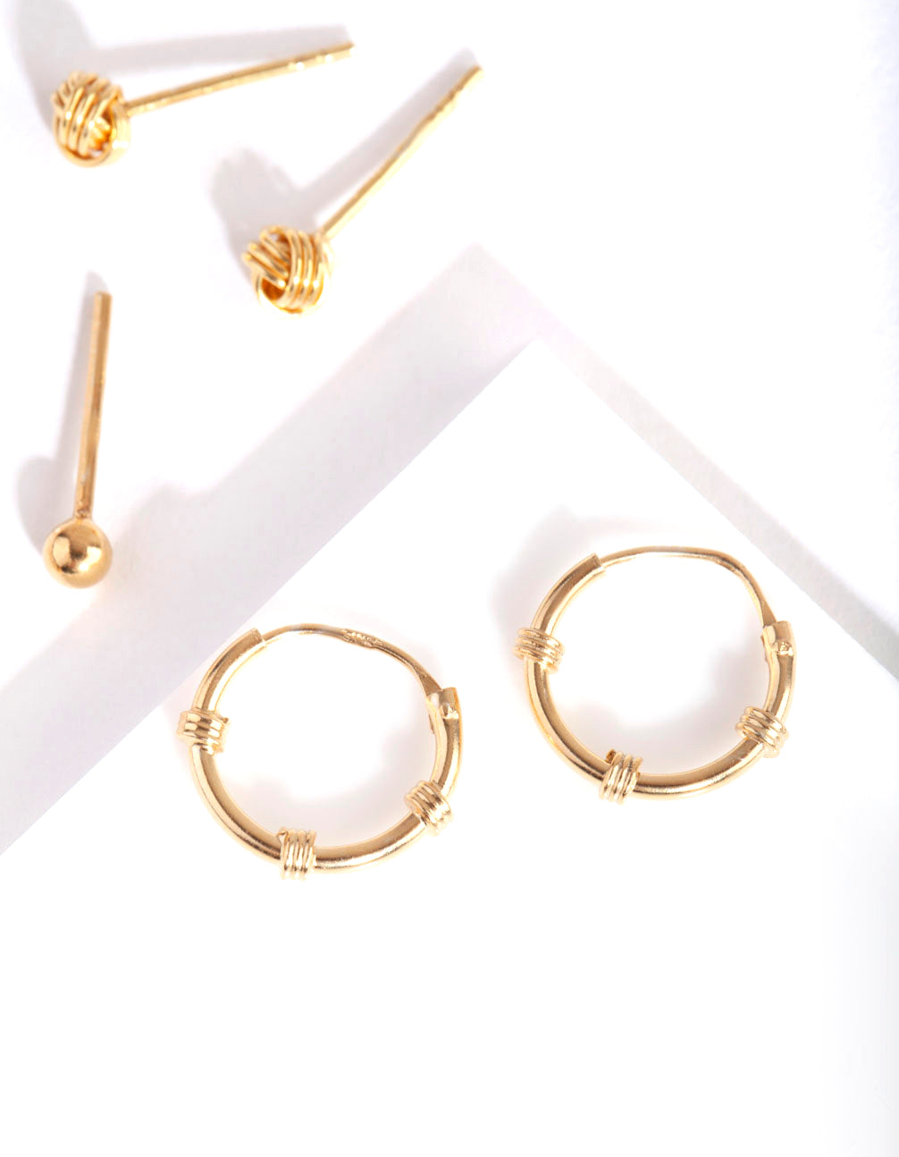Gold plated sterling silver styles are a great way to round out your collection. This earring pack comes with a knot stud and hoop design.