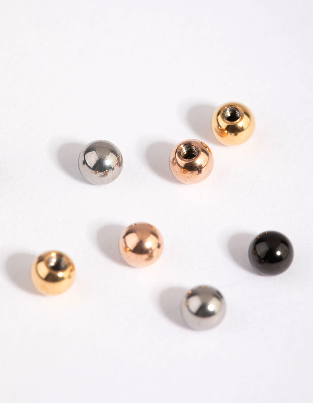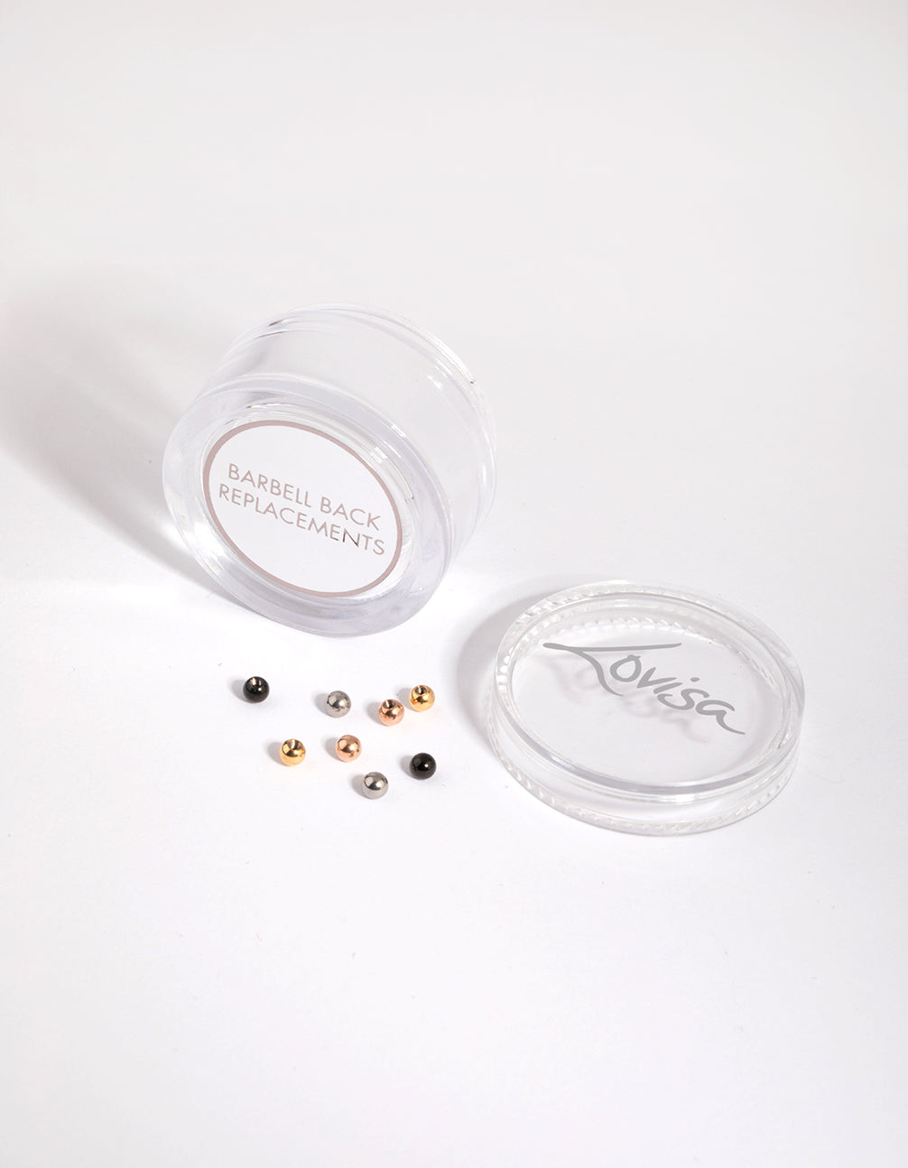 Express your individuality with Lovisa body jewellery! This useful pack contains barbell back replacements in a mix of gold, gun metal, silver and rose-gold tones. Each measures 3mm.