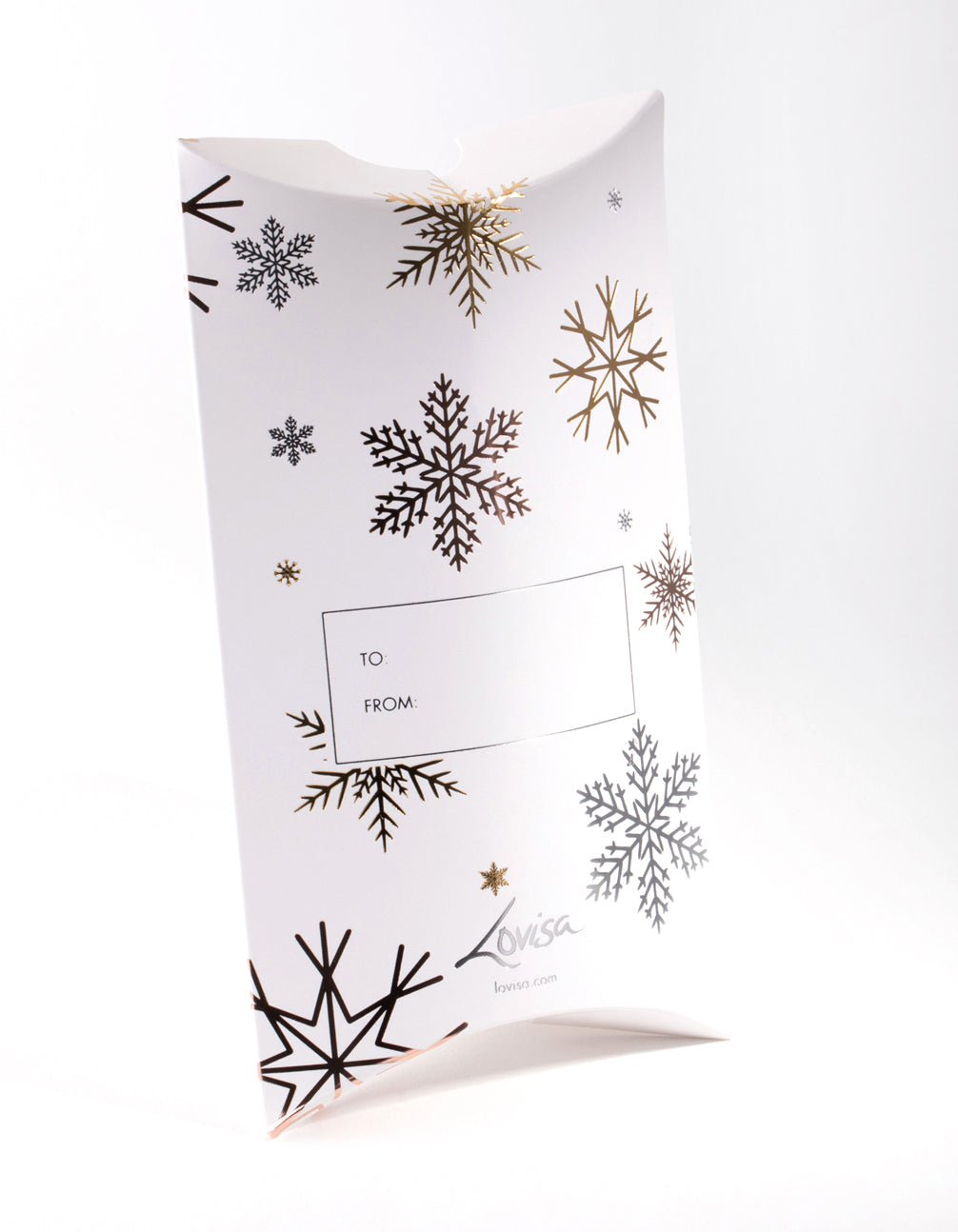 Pack your presents in this chic pillow box! Featuring gold and silver-toned snowflakes, this pillow box is the perfect addition to your packaging.