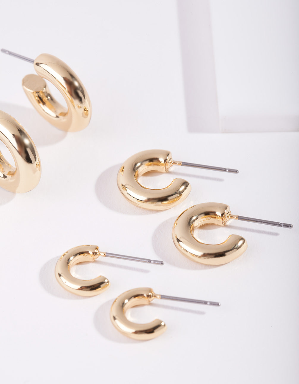 A collection of precious pieces made in the finest quality metal platings. This pack features a trio of gold plated huggie earrings perfect for stacking.