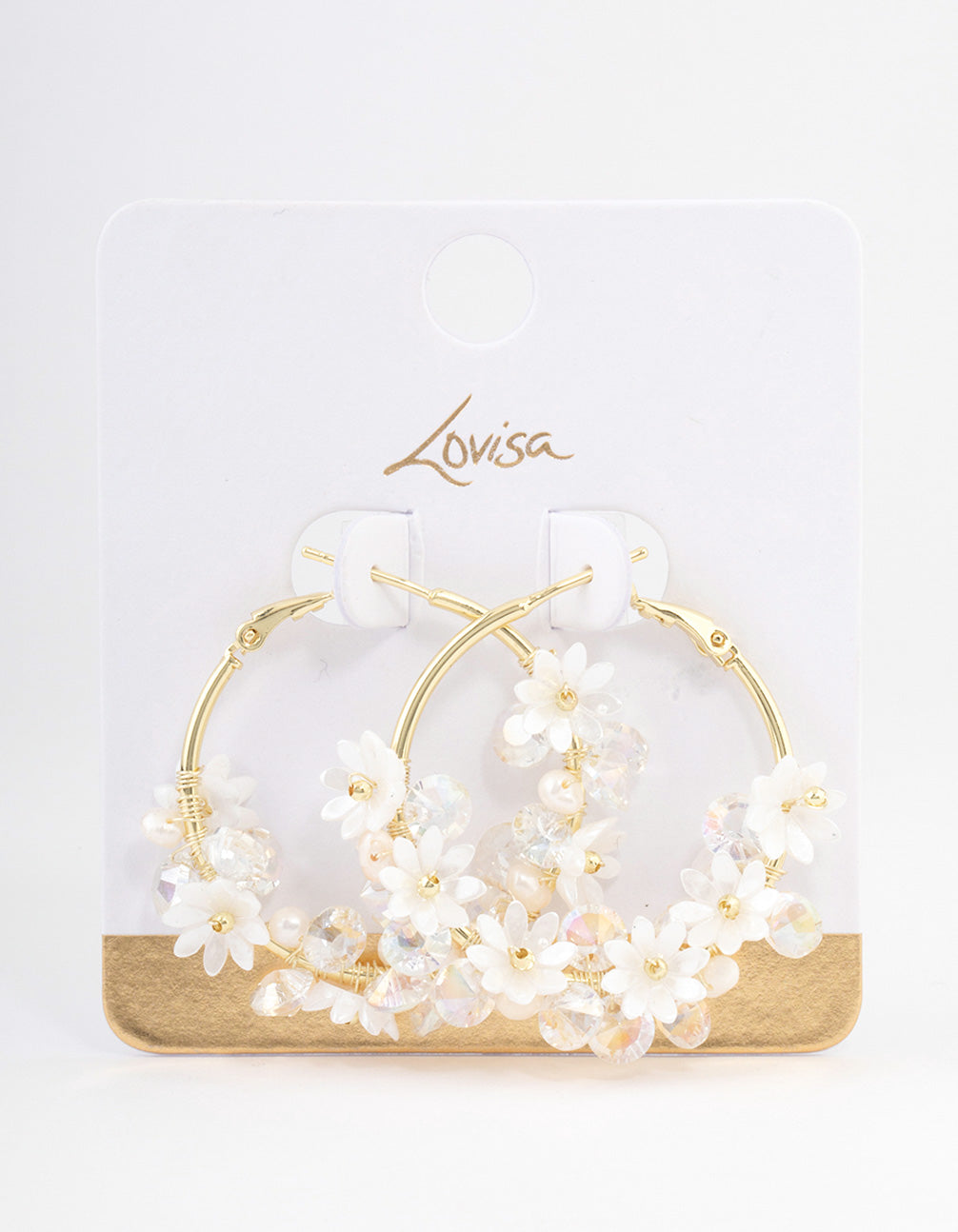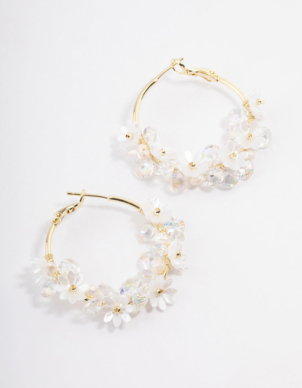 Gold Plated Freshwater Pearl Diamante Flower Hoop Earrings
