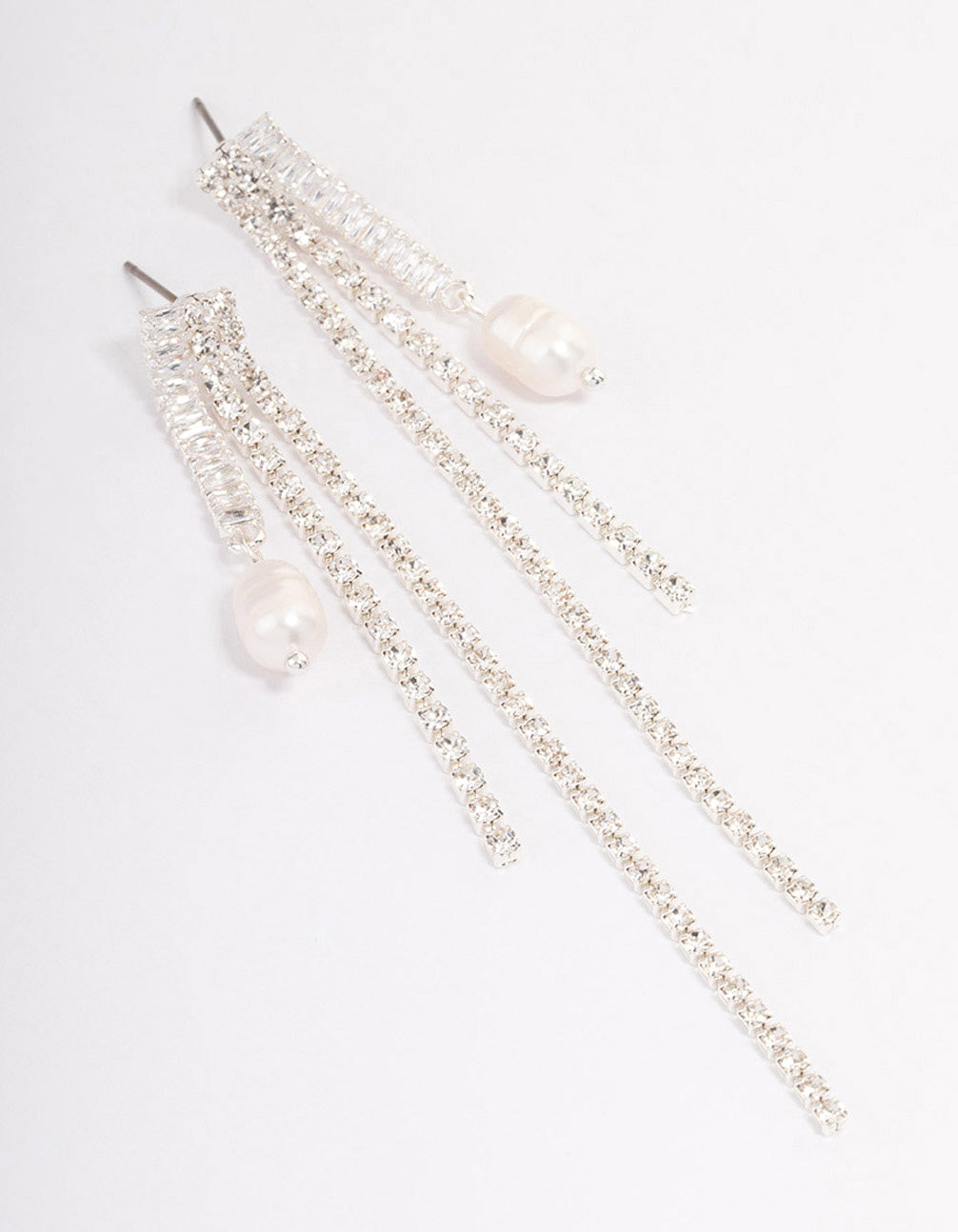 Silver Plated Cubic Zirconia Cupchain Pearl Drop Earrings