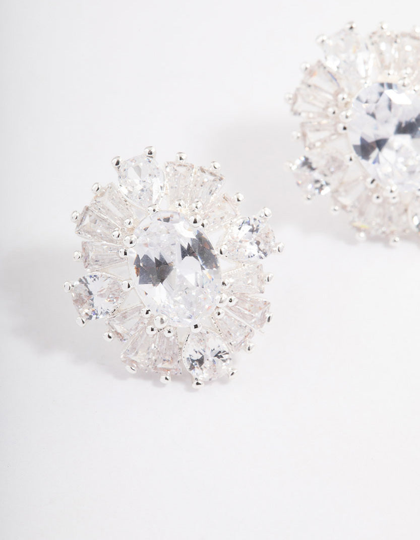 Silver Plated Cubic Zirconia Oval Halo Stud Earrings