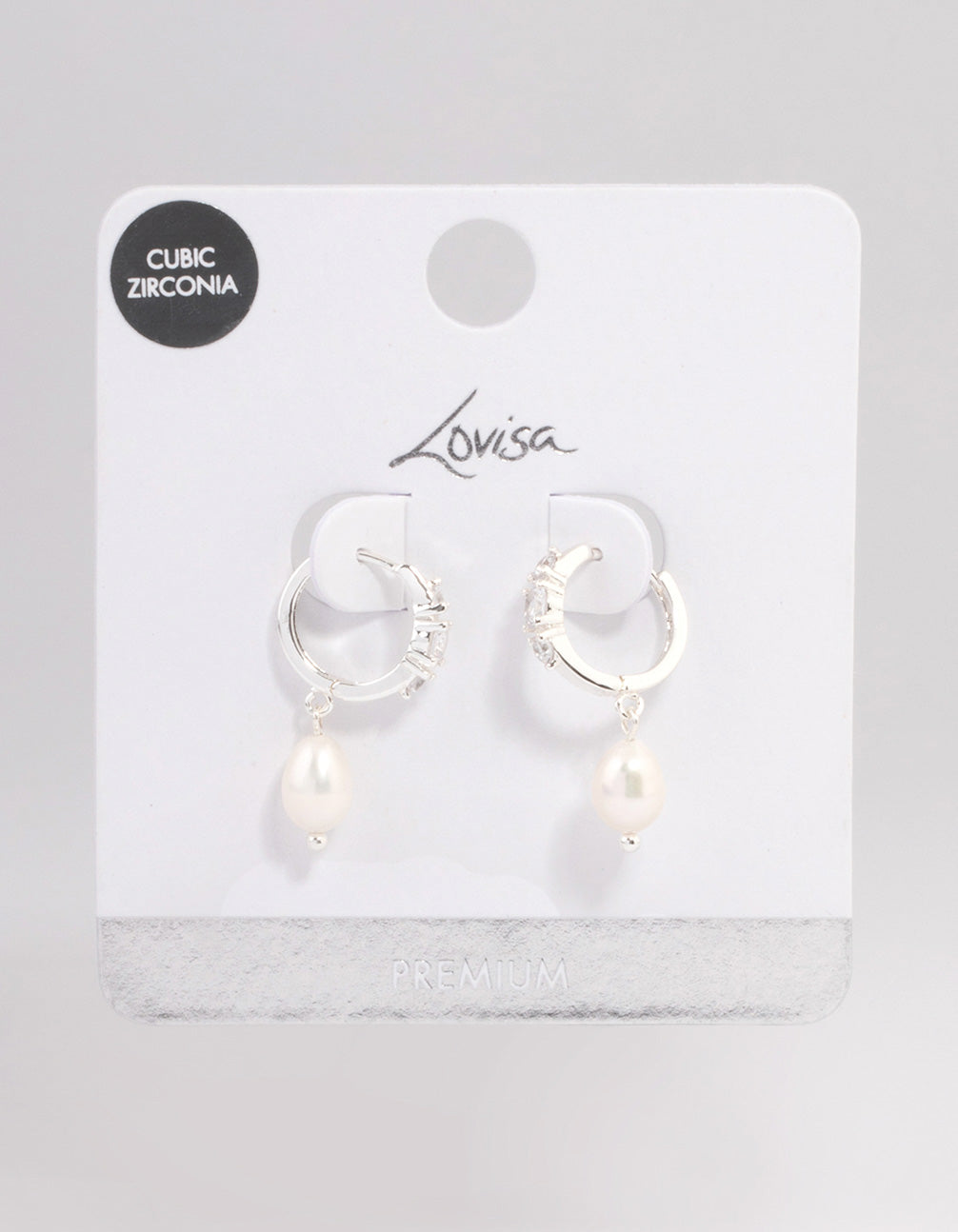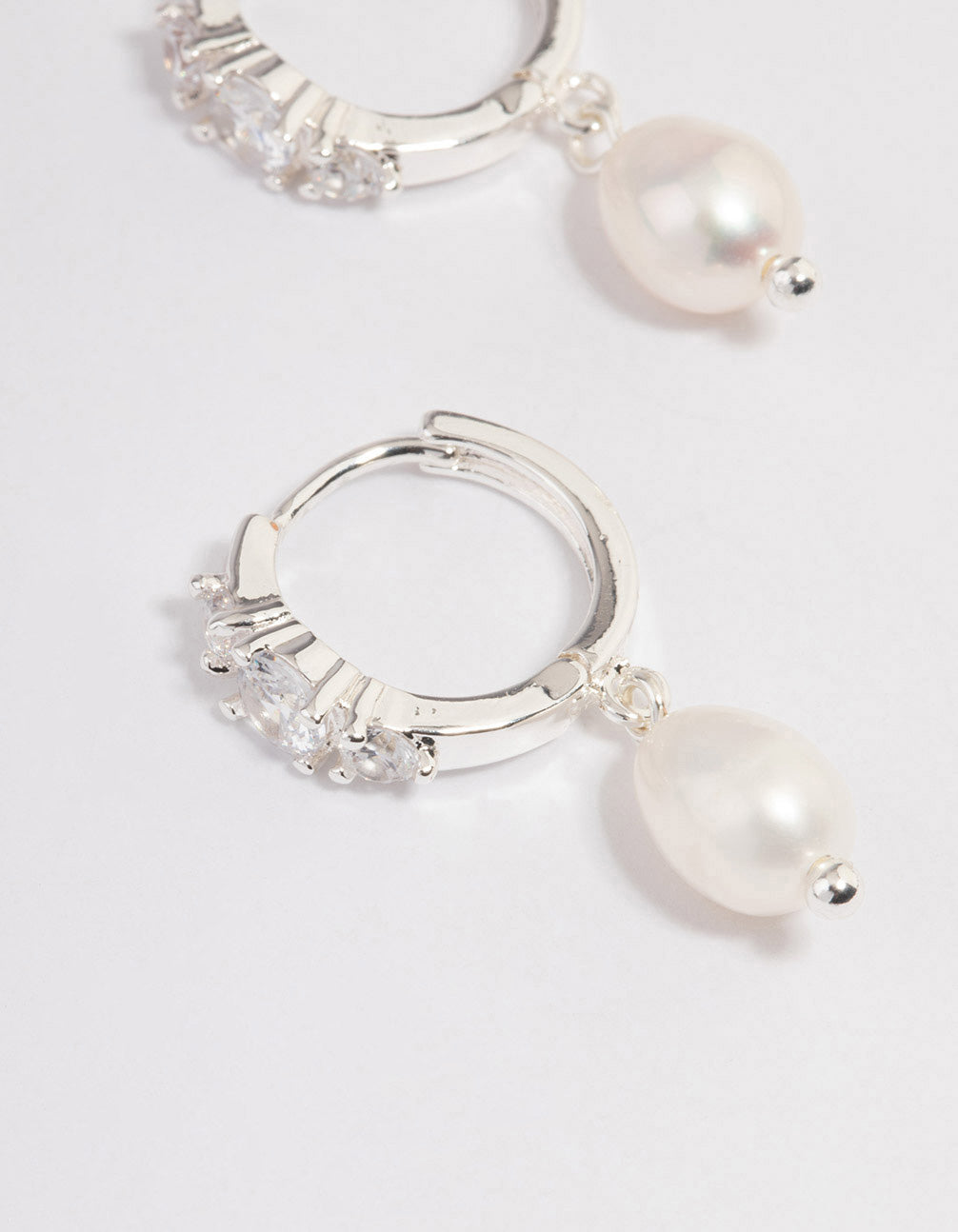 Silver Plated Freshwater Pearl Drop Cubic Zirconia Small Huggie Earrings