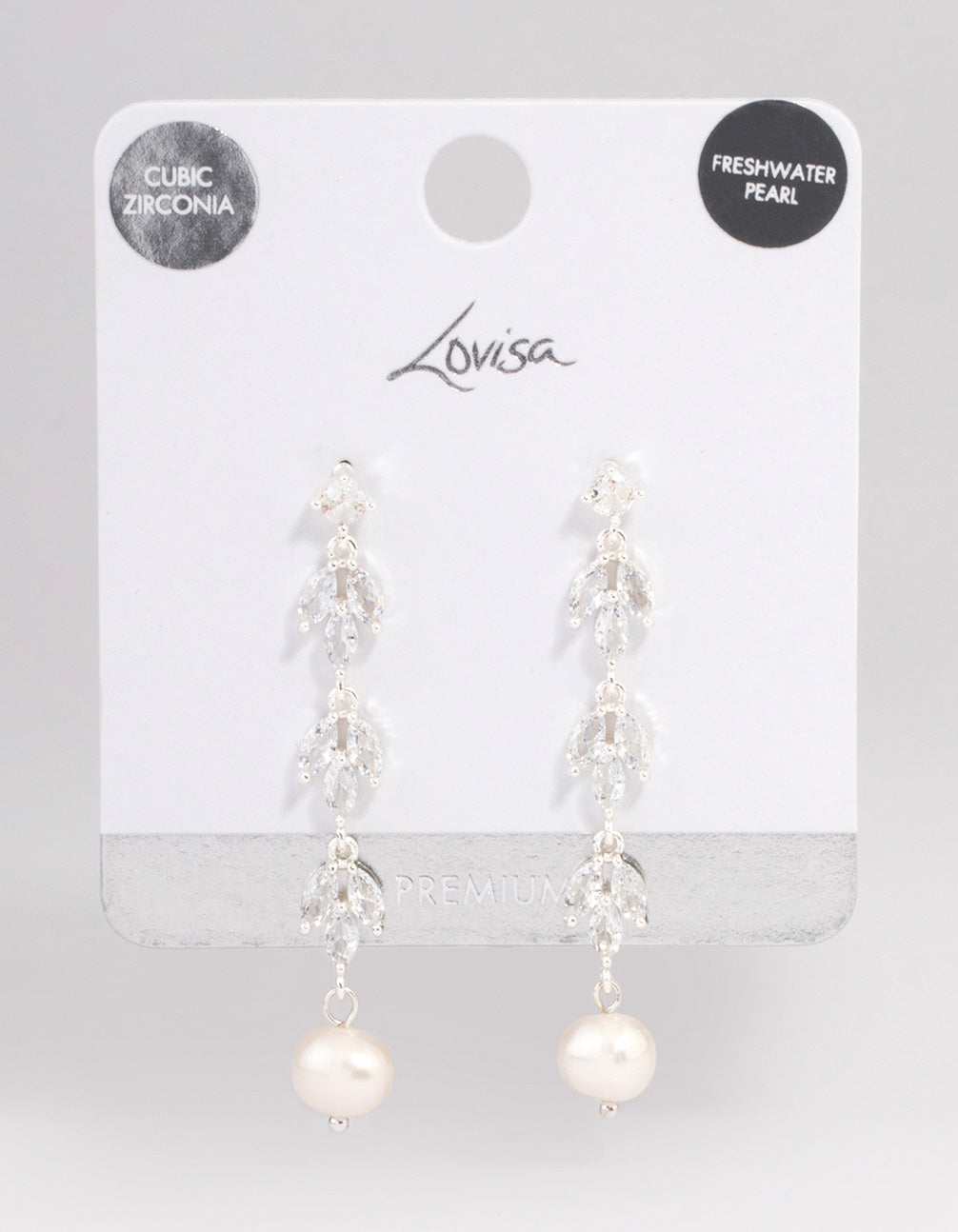 Silver Plated Leaf Pearl Cubic Zirconia Drop Earrings
