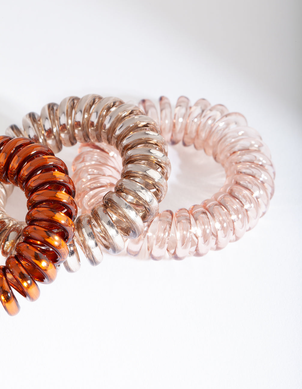 Hair spirals are an innovative invention you need in your hair styling! Spiral Hair Ties are a gentle alternative to other hair elastics and rubber bands because they don't wrap too tightly or apply pressure and pulling to your hair. This pack of grey, mustard, pink and rust spiral ties are a must-have!
