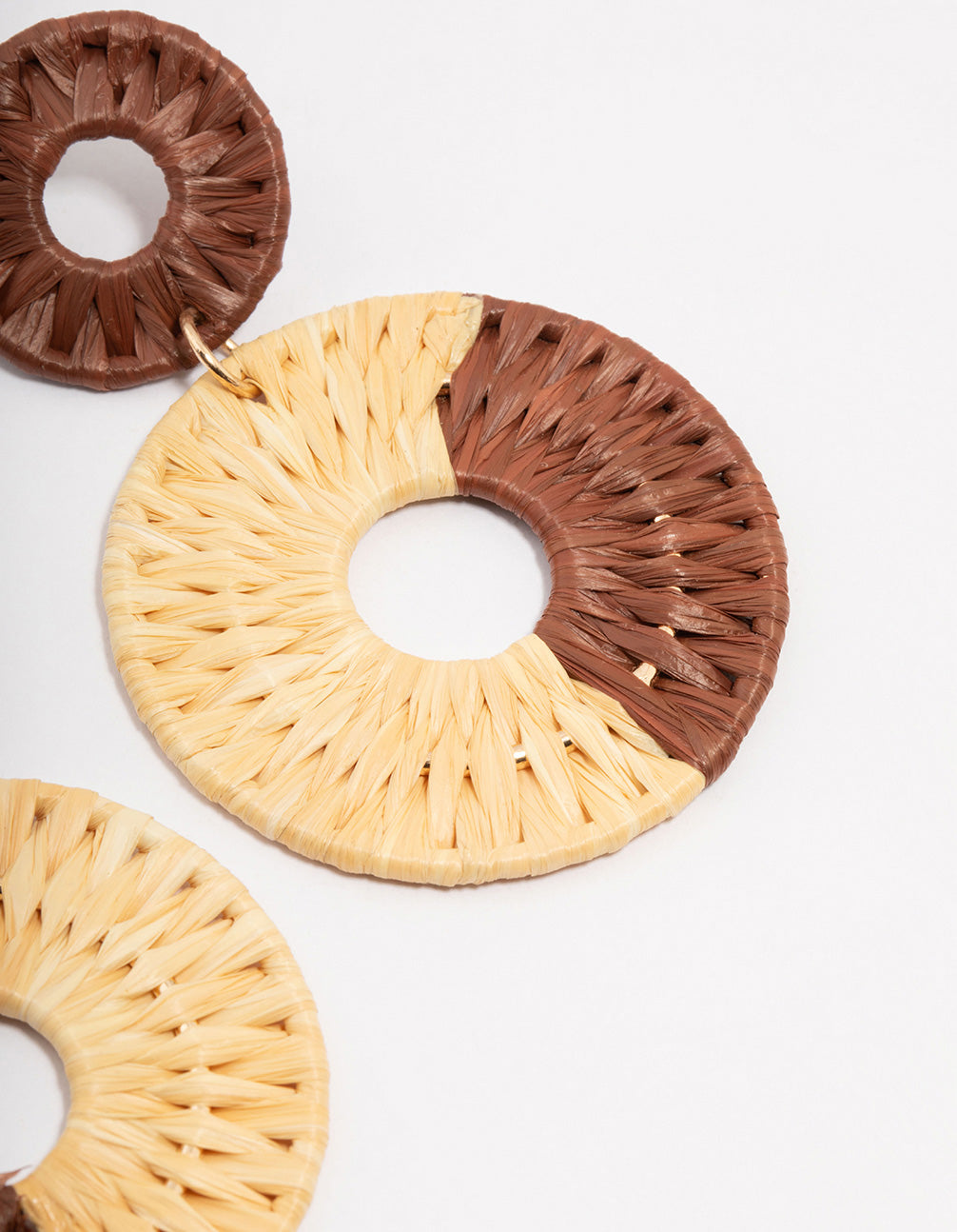 These lovely, round drop earrings feature a two-toned, raffia texture.